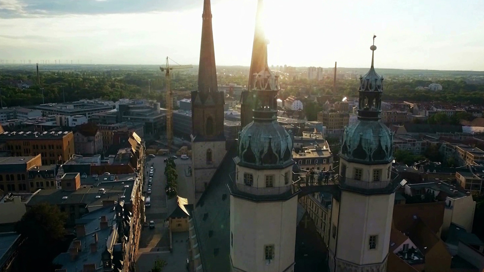 Description: A city with a lot of tall buildings and towers with a sun in the background and a sky line.