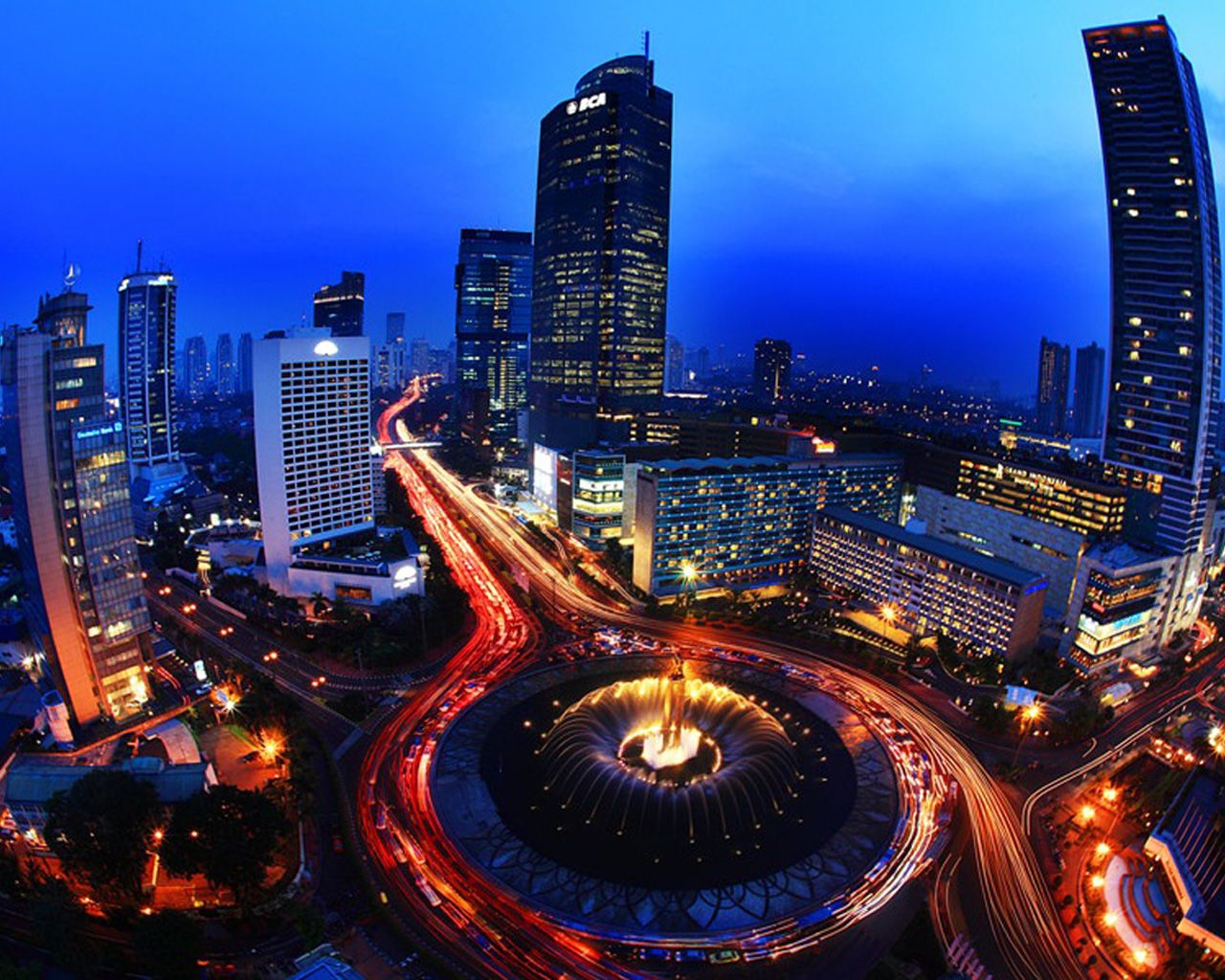 Description: A city with a lot of traffic and tall buildings at night time with lights on the street and a fountain.