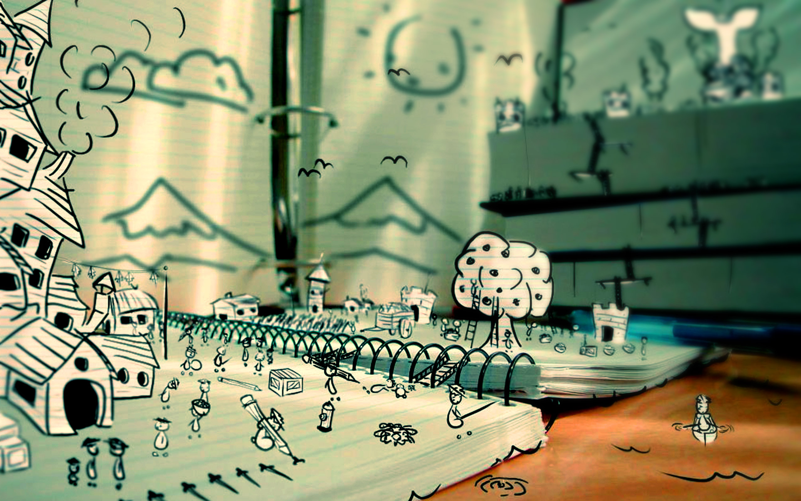 Description: A drawing of a city with a tree and buildings on it and a notebook with a pen in front of it.