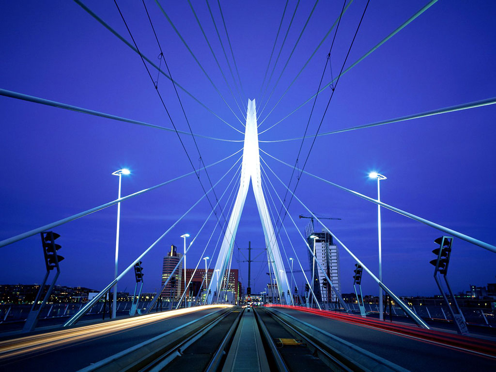 Description: A view of a city from a bridge at night time with traffic lights and street lights on the side.