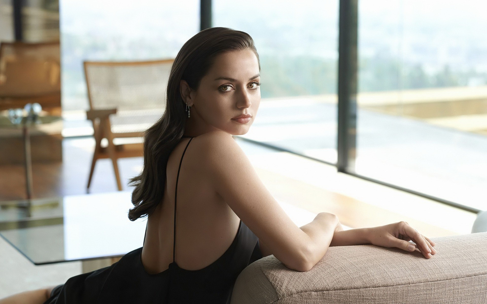 Description: A woman sitting on a couch in a room with large windows and a view of the city outside the window.