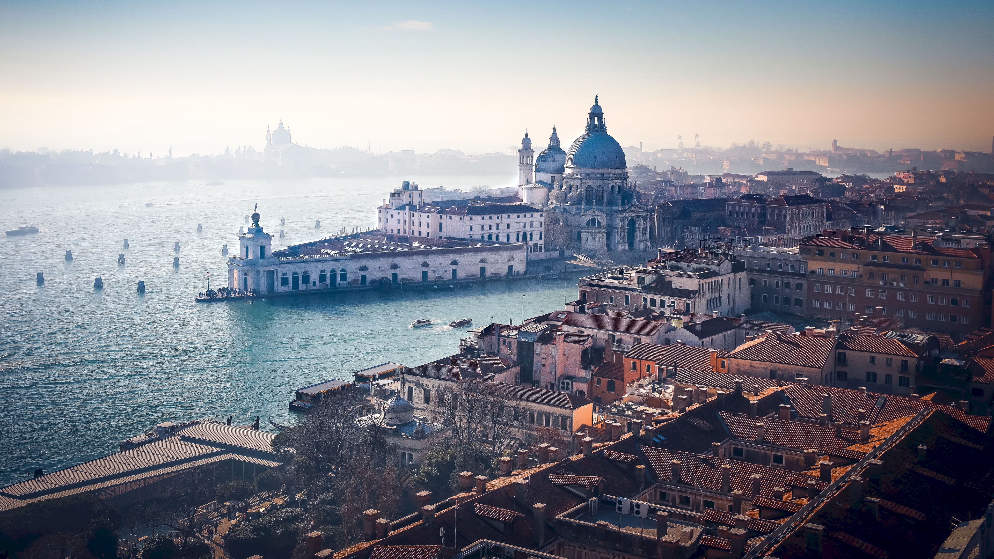 Description: A city with a large body of water and a bridge in the middle of it with a large building in the middle of the water.