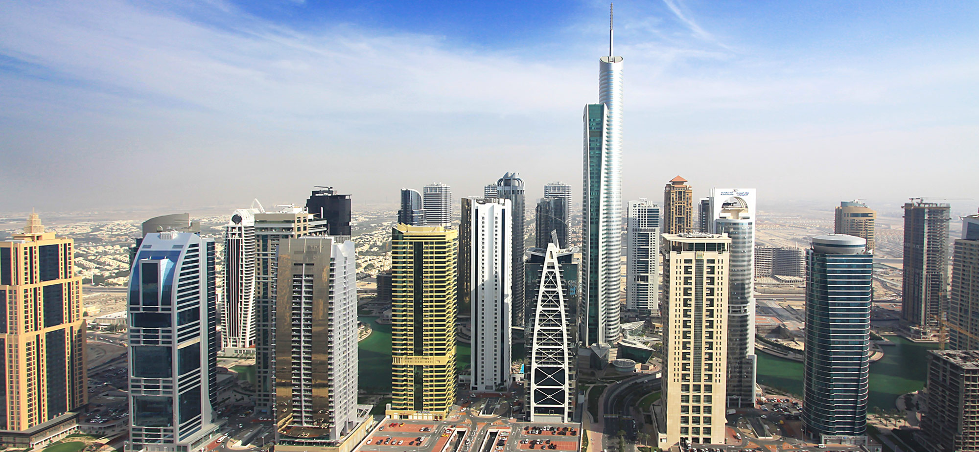 Description: A city with tall buildings and a blue sky in the background with a few clouds in the sky above.