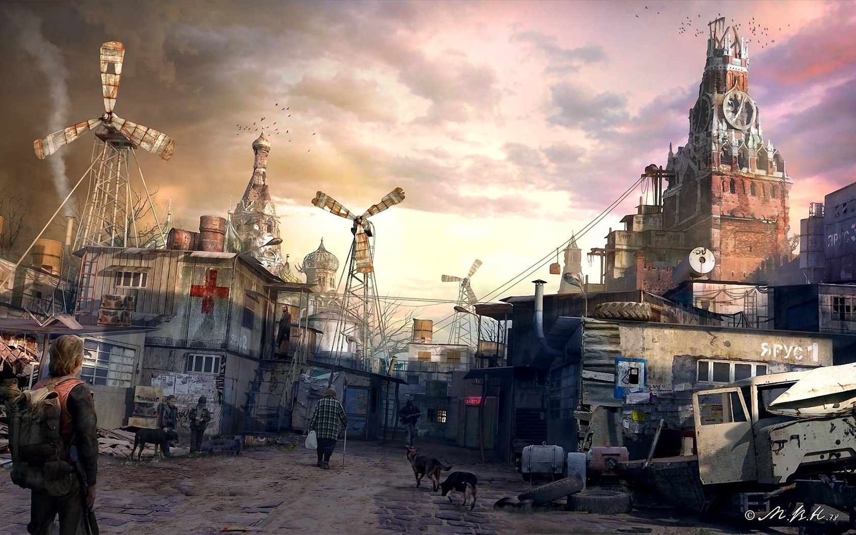 Description: A painting of a city with a lot of buildings and people walking around it and a dog on the street.