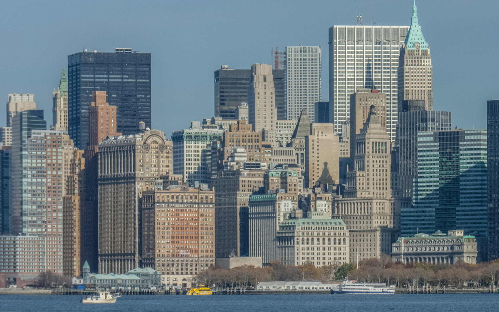 Description: A large city with tall buildings and a boat in the water in front of it and a boat in the water.