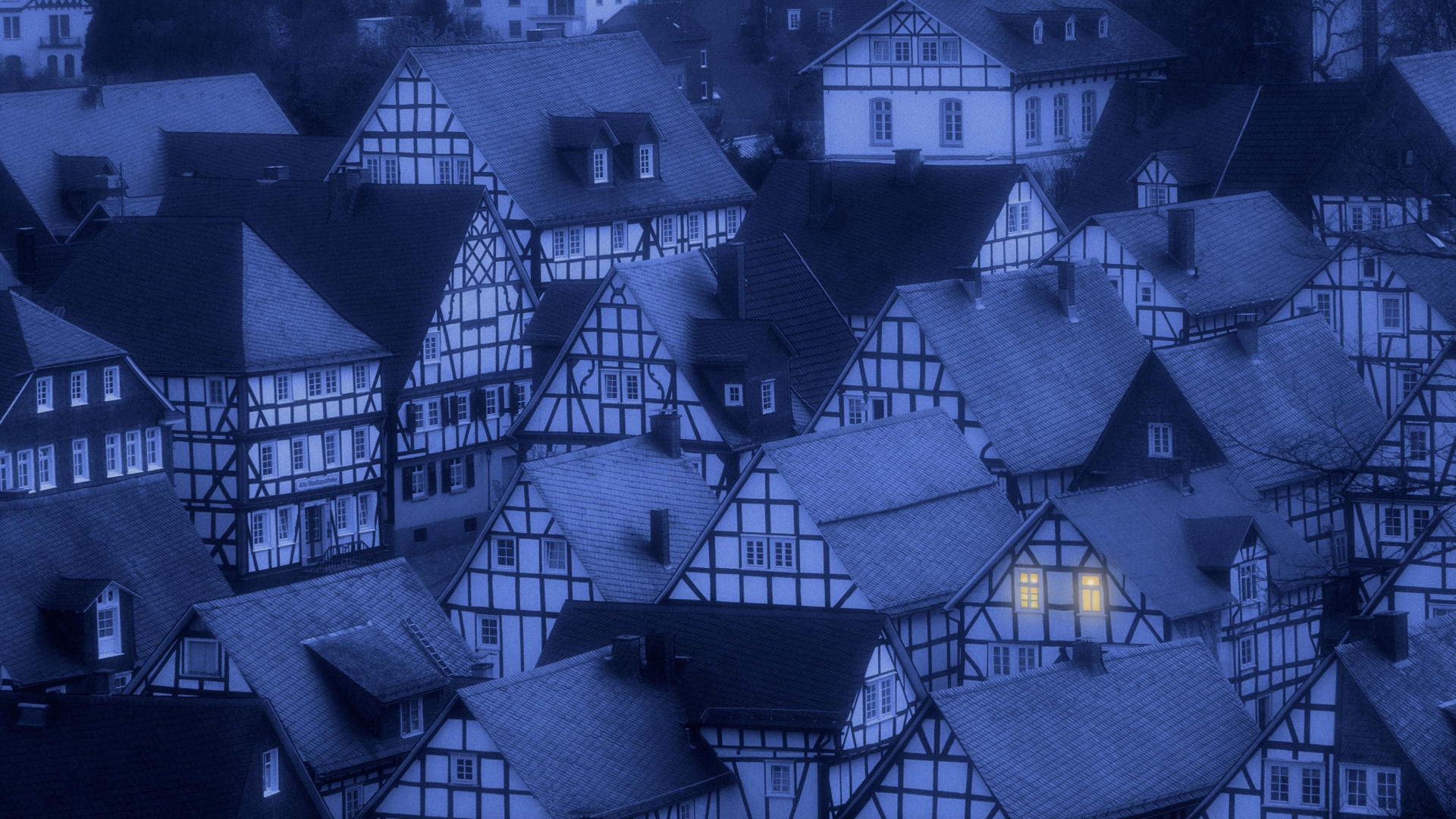 Description: A large group of houses with a clock on the top of them in a city at night time with a full moon.