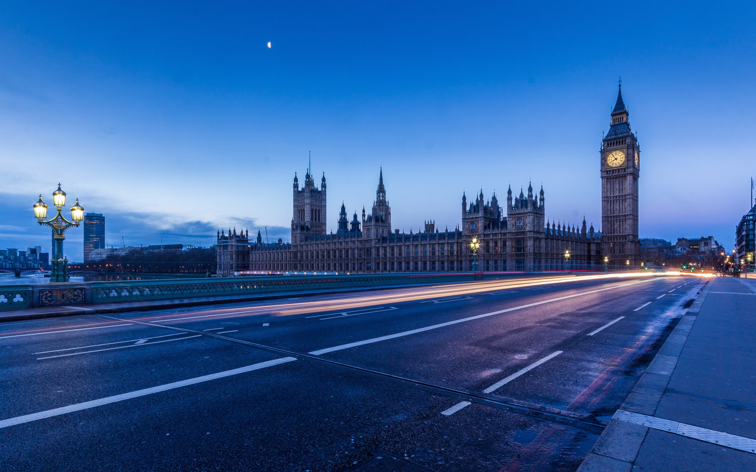 Description: A city street with a clock tower in the background at dusk with a long exposure of light streaks on the road.