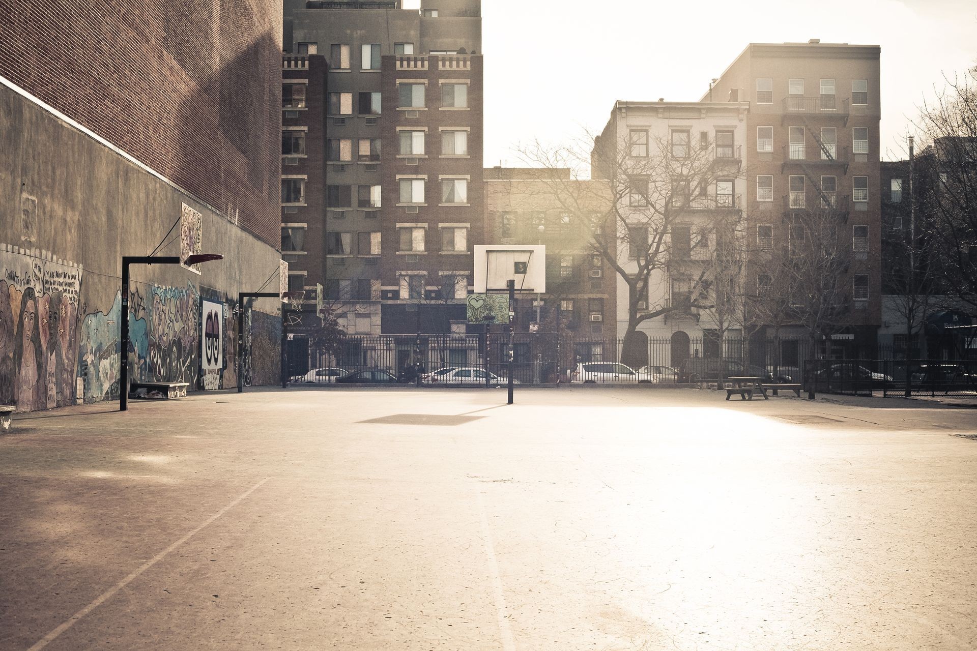 Description: A person walking down a street in a city with tall buildings and graffiti on the walls of the buildings.
