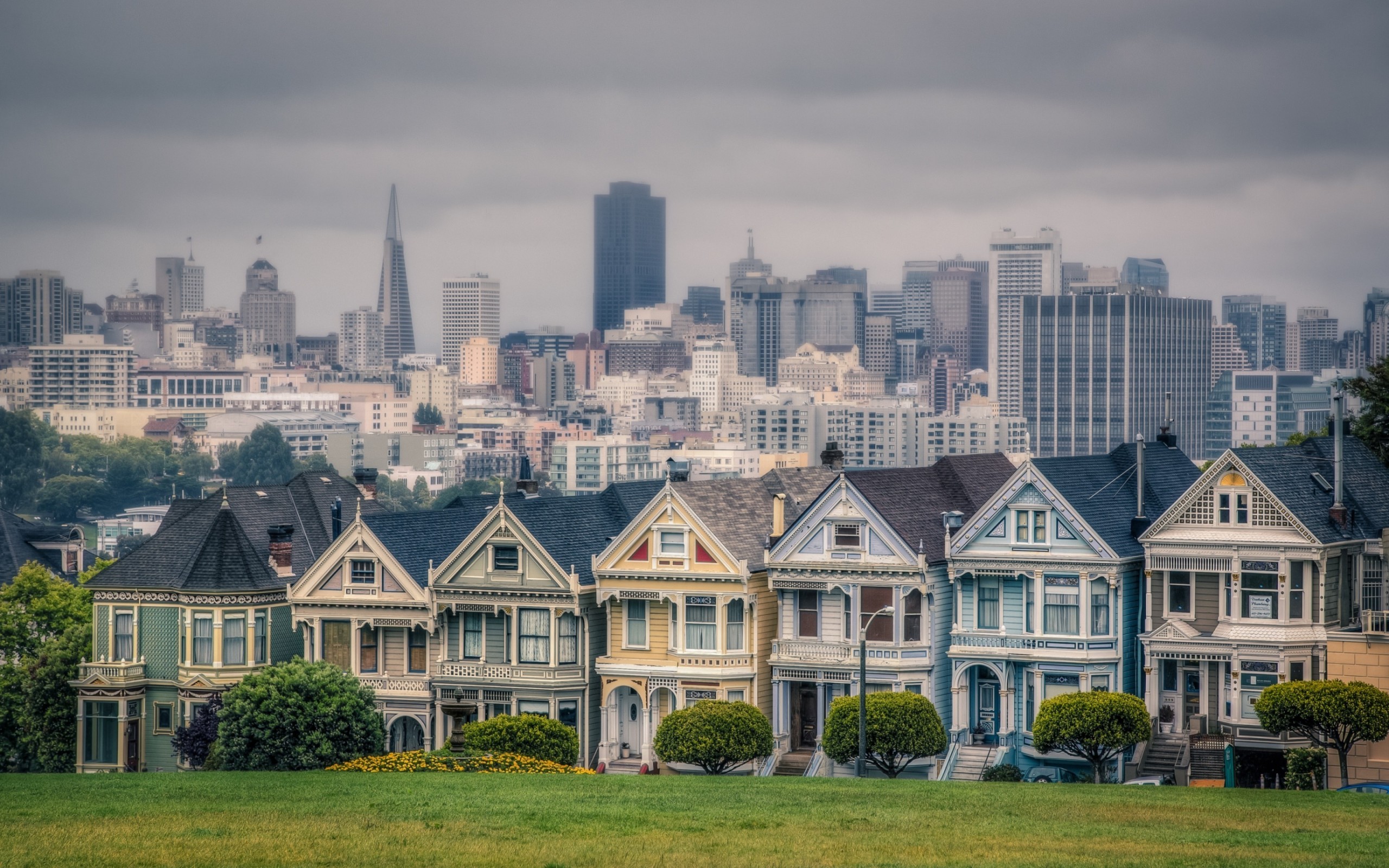 Description: A row of houses in a city with a view of the city in the background of the photo.