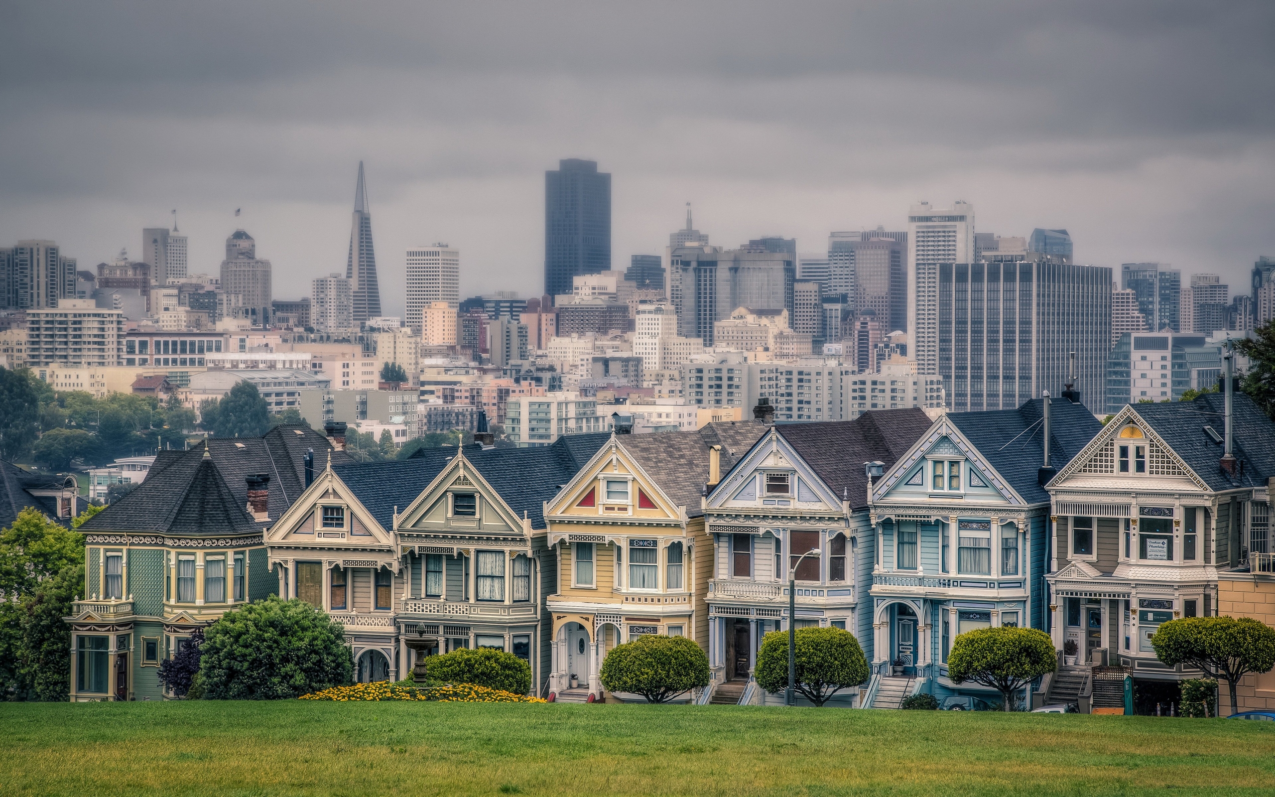 Description: A row of houses in front of a city skyline with a cloudy sky in the background.