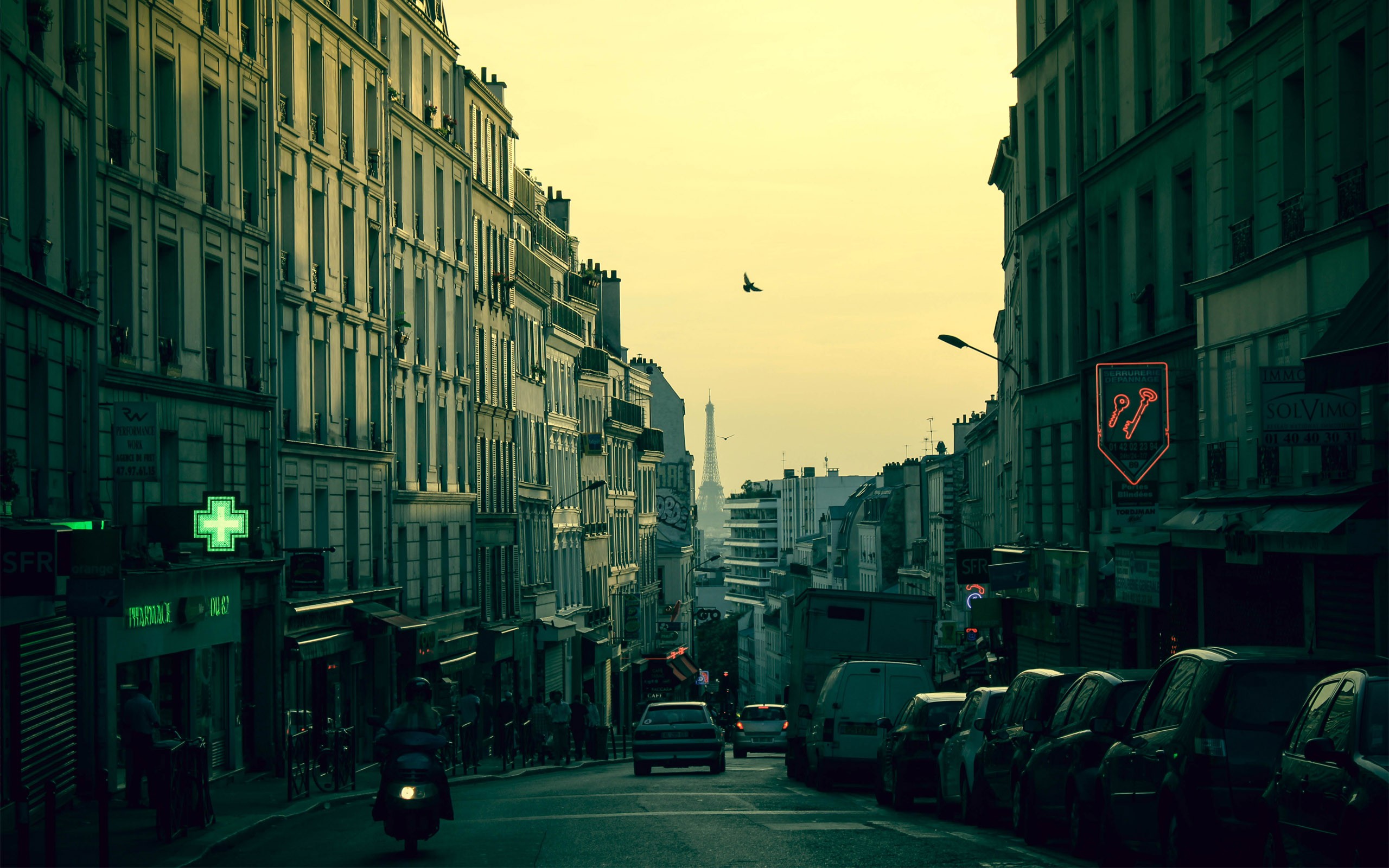 Description: A city street with a few cars parked on the side of it and a person riding a motorcycle on the side.