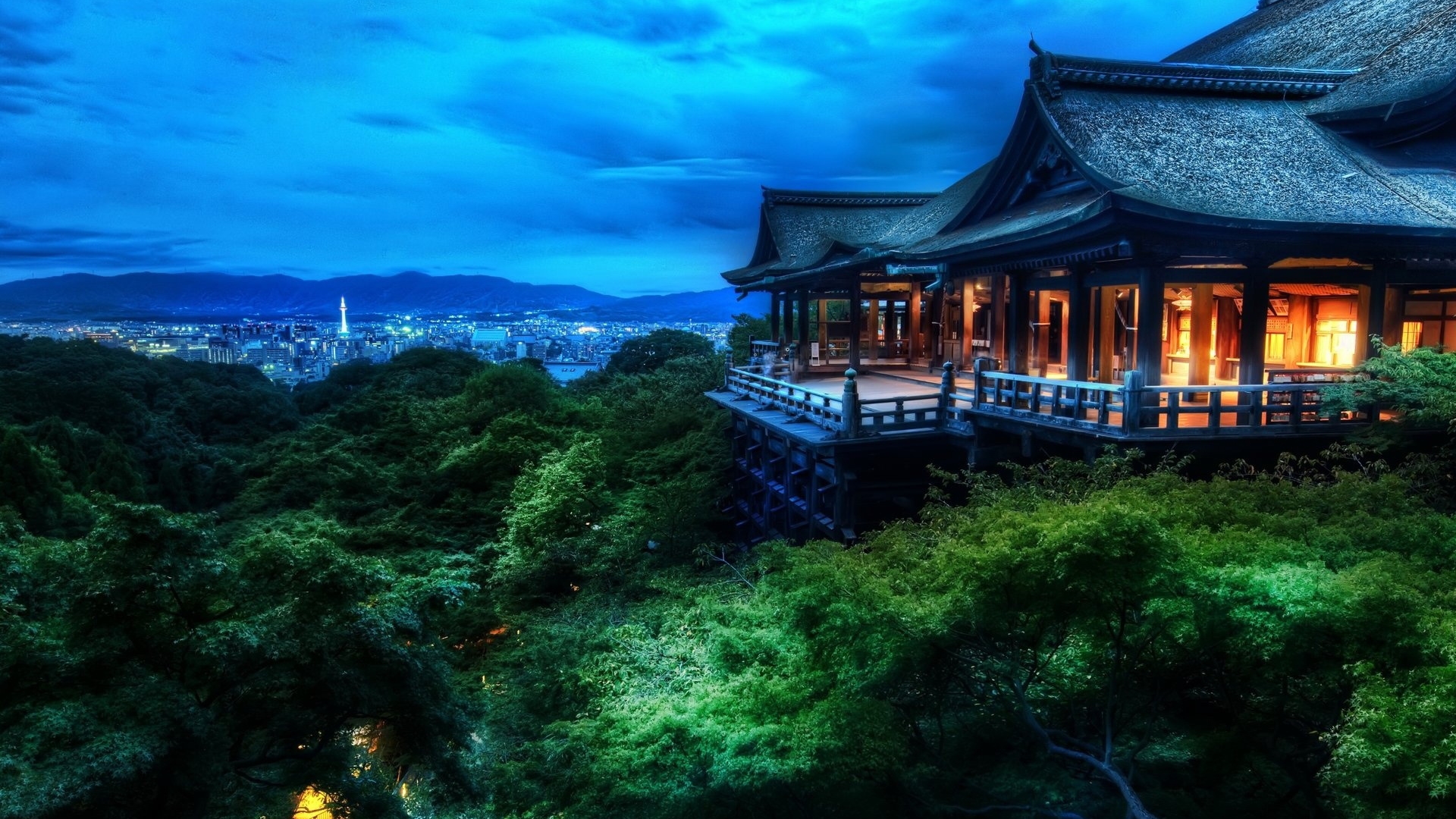 Description: A building with a balcony and a view of the city at night time with a cloudy sky above it.