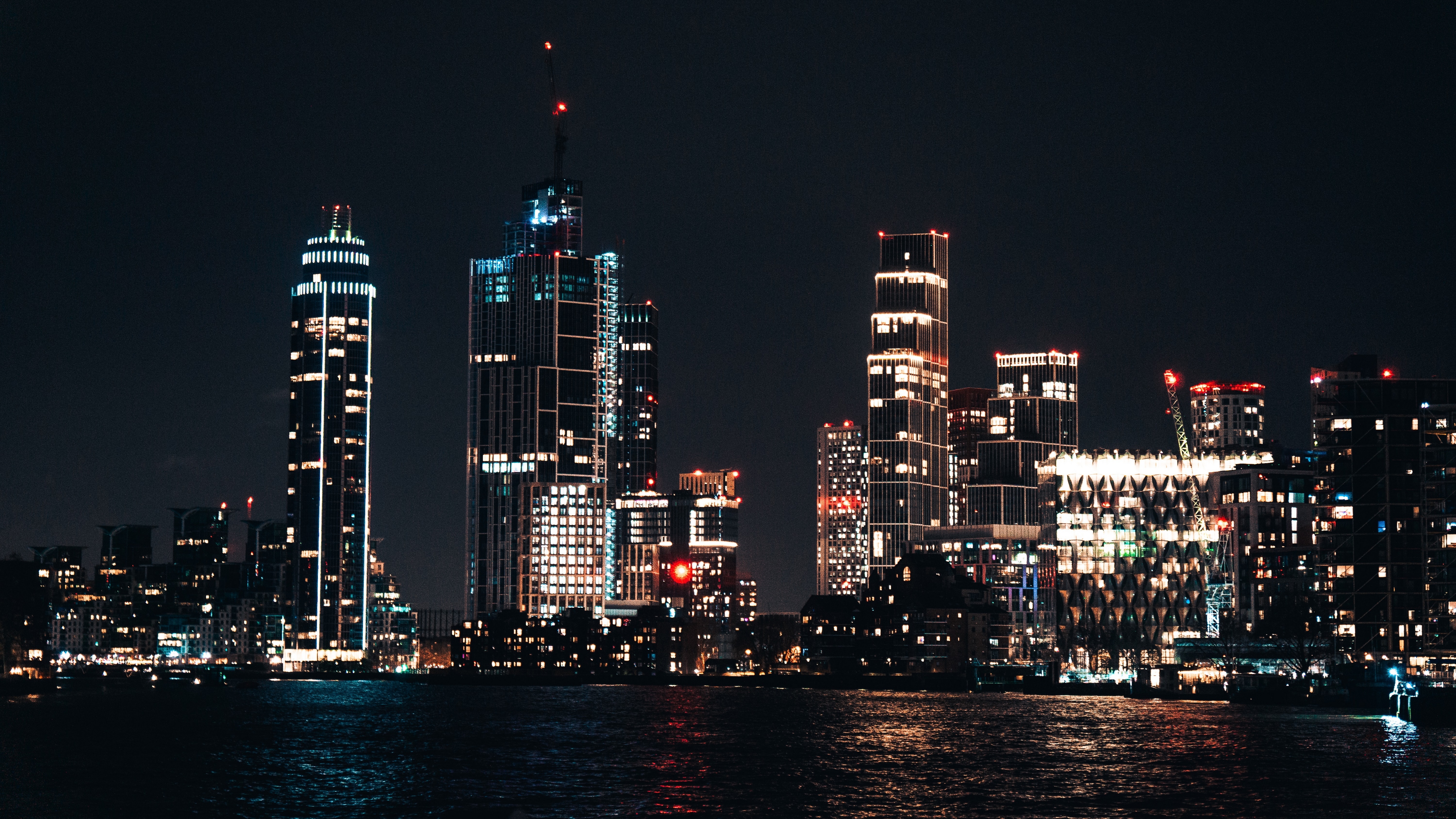 Description: A city skyline at night with a lot of lights on it and a boat in the water in front of it.