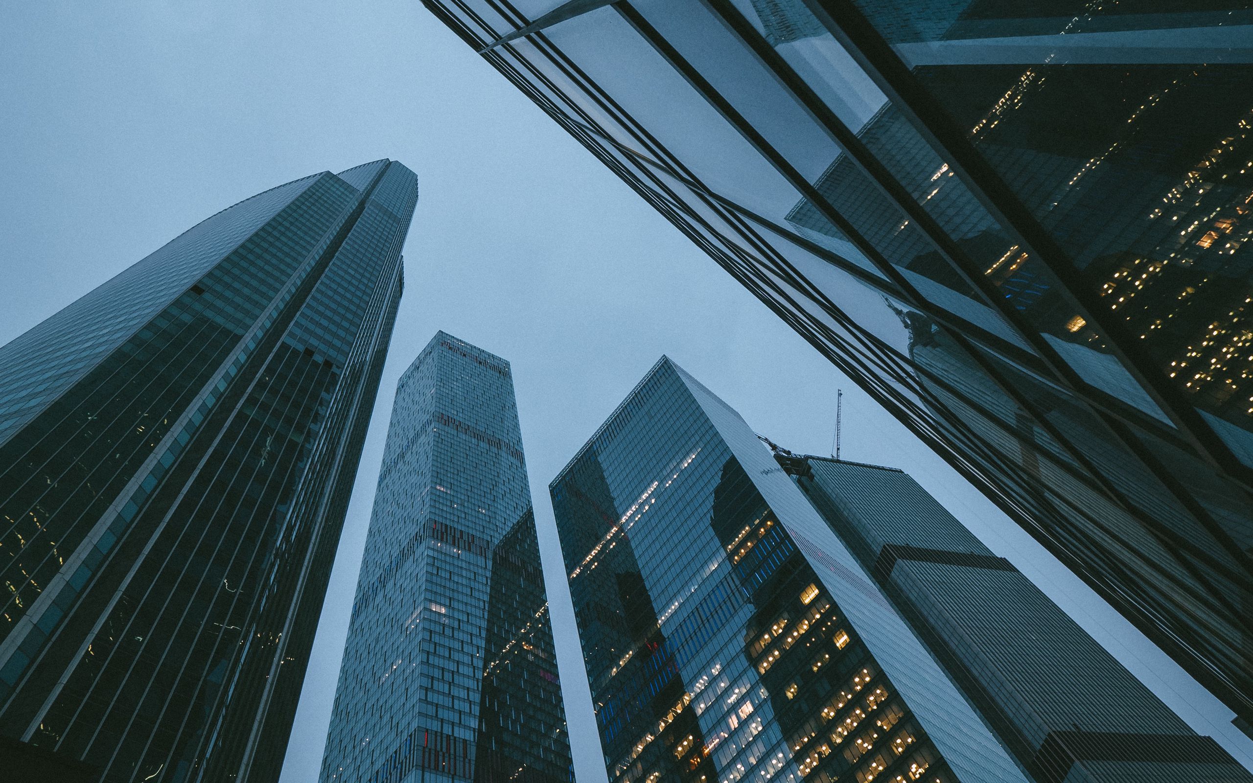 Description: A group of tall buildings in a city at night time with lights on them and a sky line in the background.