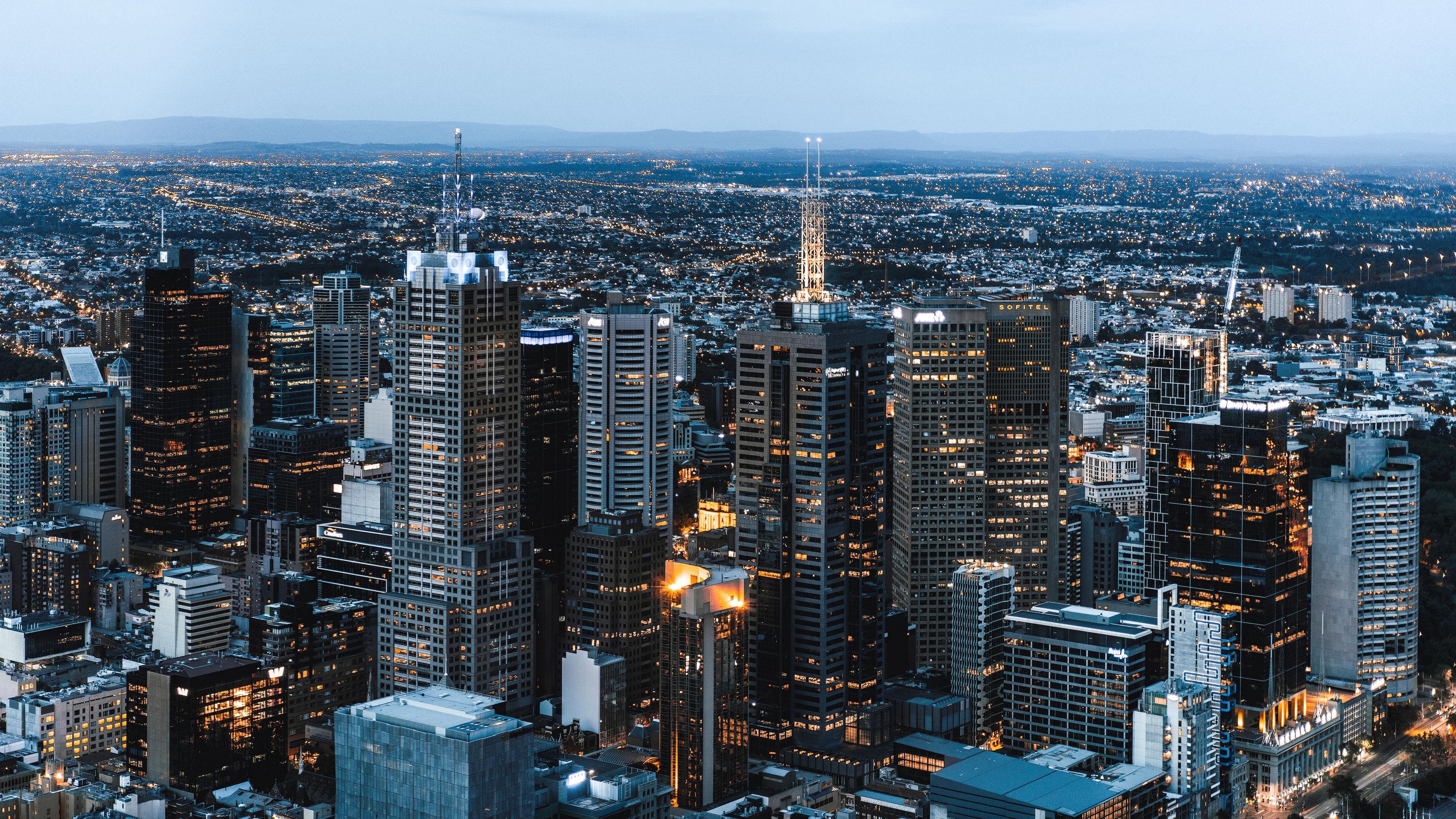 Description: A cityscape with a lot of tall buildings at night time with lights on them and a sky line.