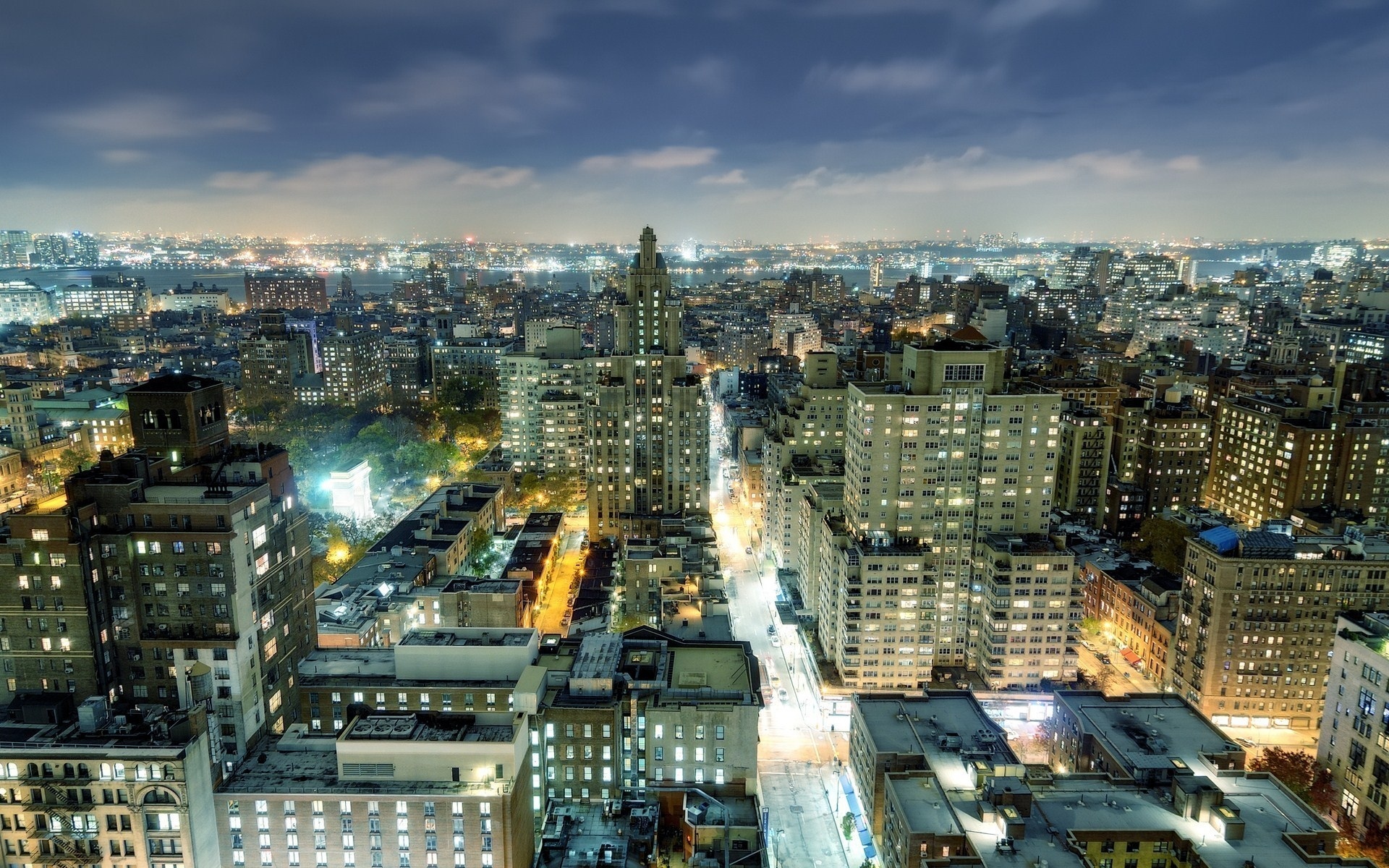 Description: A cityscape with a lot of tall buildings at night time with lights on them and a cloudy sky.