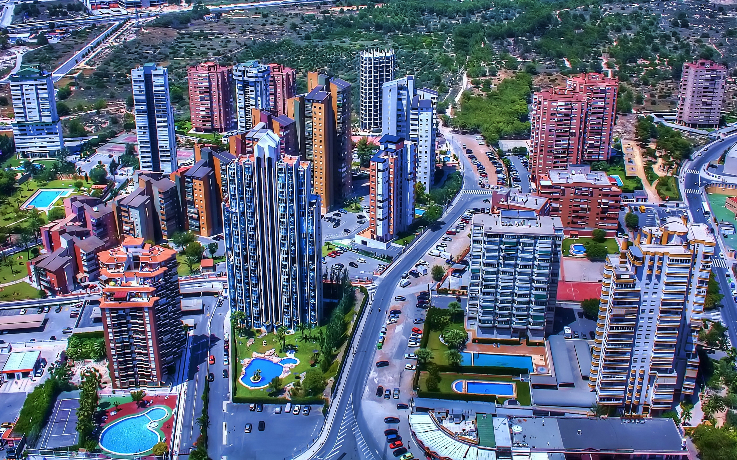 Description: A city with a lot of tall buildings and a pool in the middle of it.