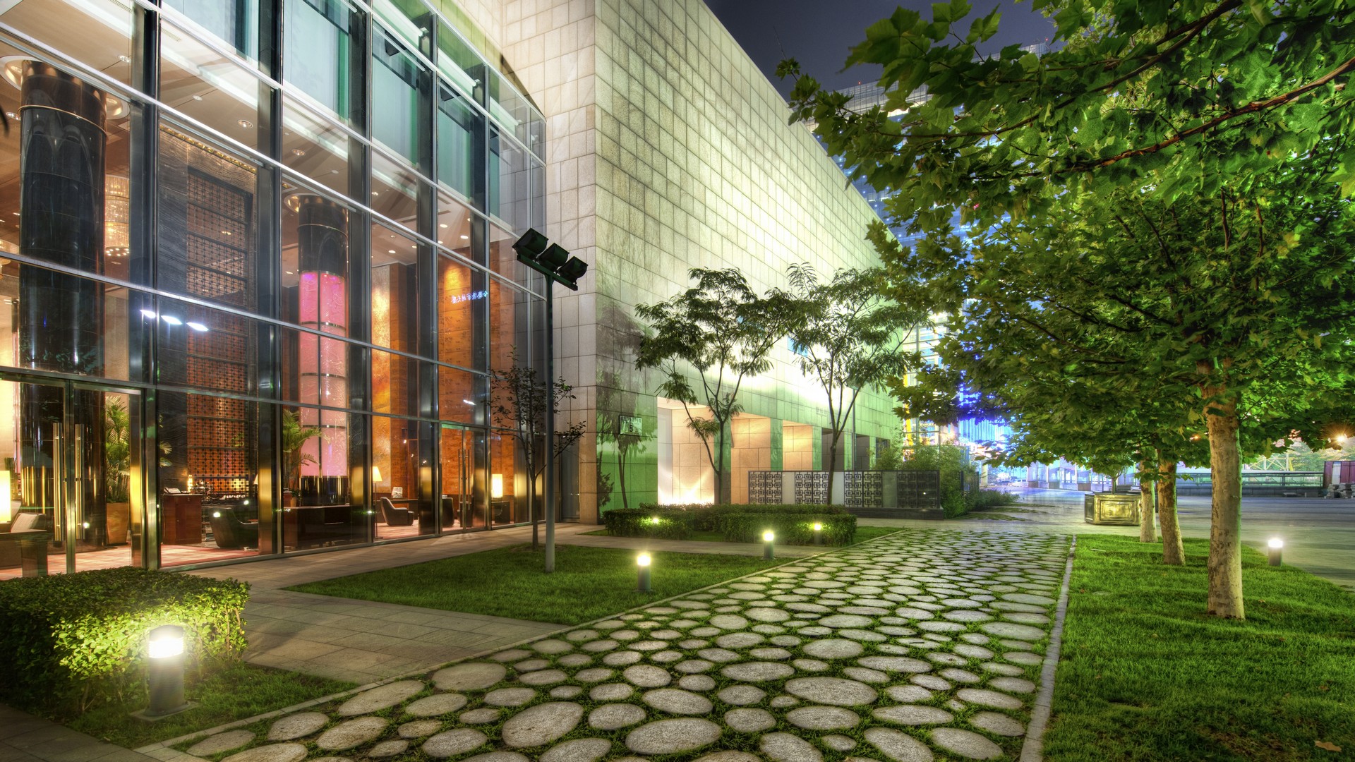 Description: A building with a lot of windows and a walkway in front of it at night time with lights on.
