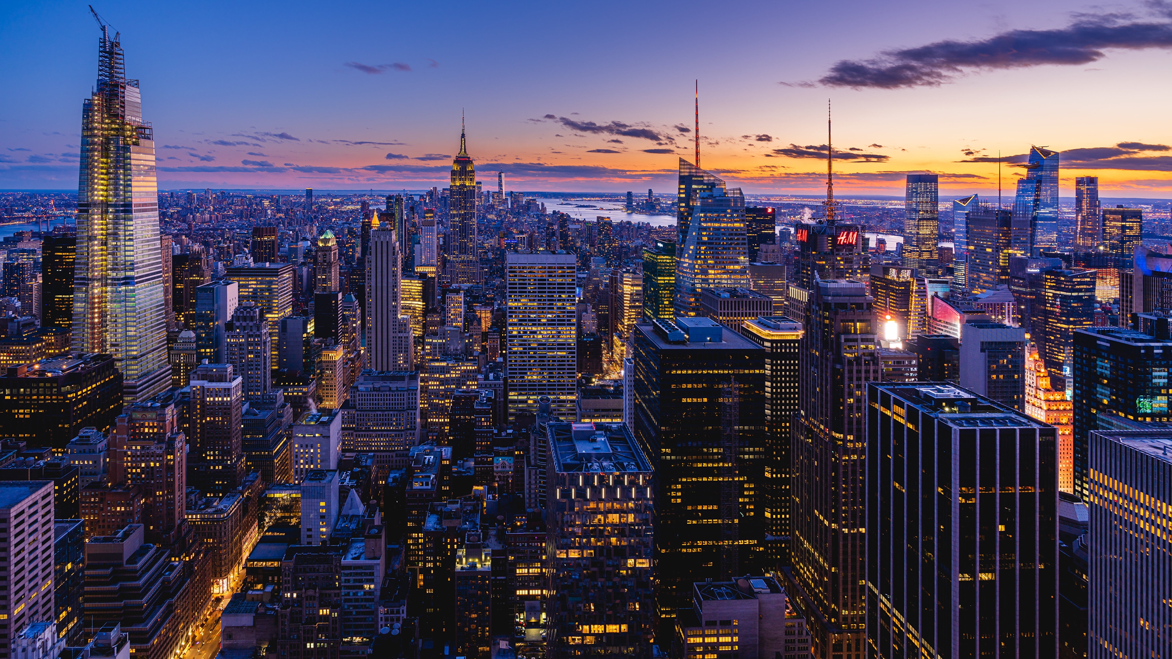 Description: A city skyline at night with a lot of tall buildings and a river in the background with a sunset.