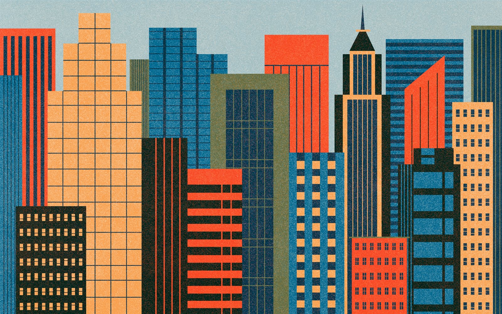 Description: A city with tall buildings and a blue sky background with a few clouds in the distance and a few buildings in the foreground.