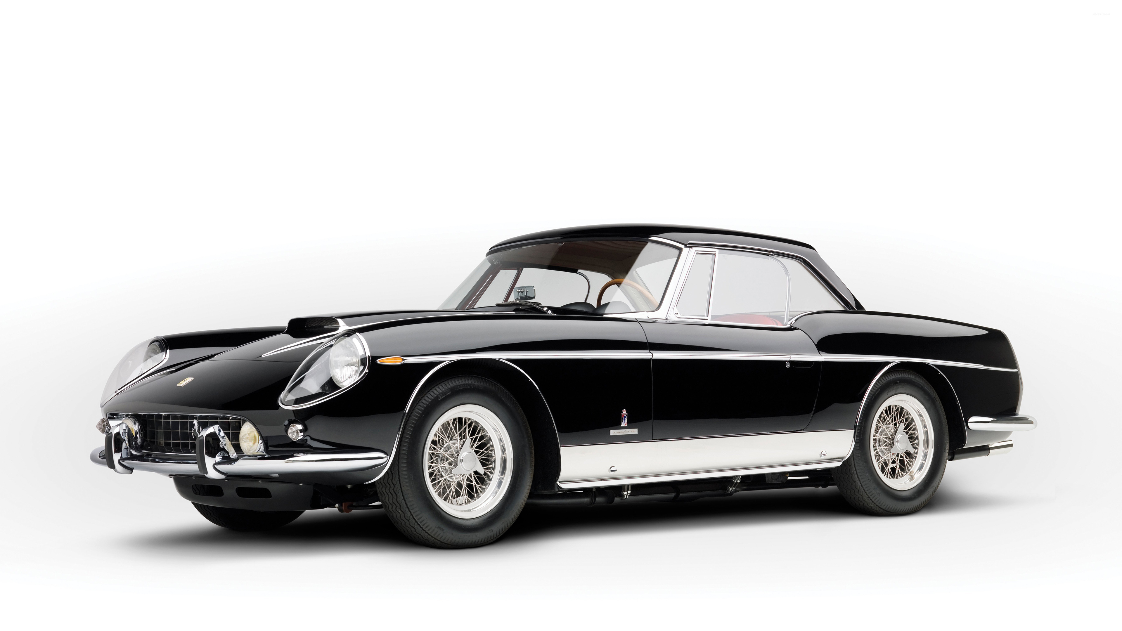 Description: A black and white photo of a classic car on a white background with a shadow of the car on the floor.