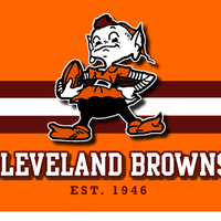 Description: Cleveland browns football team logo with a cartoon character holding a football ball in his hands and a football helmet on his chest.