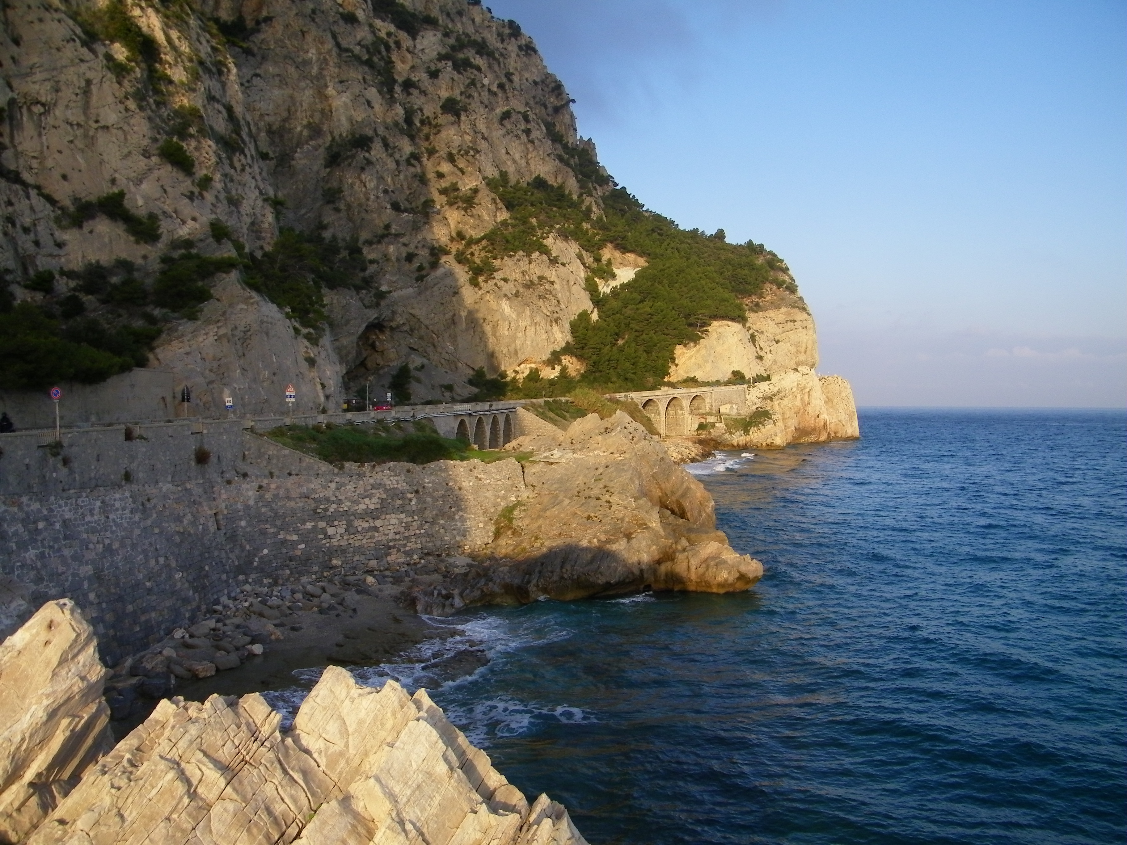 Description: A cliff with a bridge on the side of it next to the ocean with people walking on it and a cliff with a bridge on top.