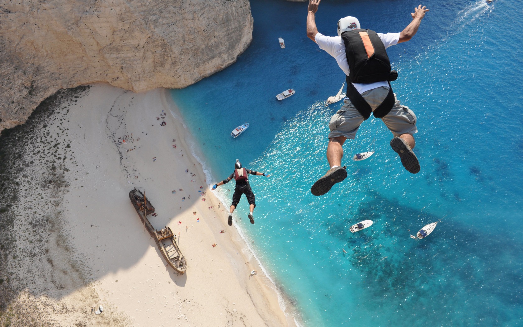 Description: A man jumping off a cliff into the ocean from a cliff above a beach with boats and boats in the water.