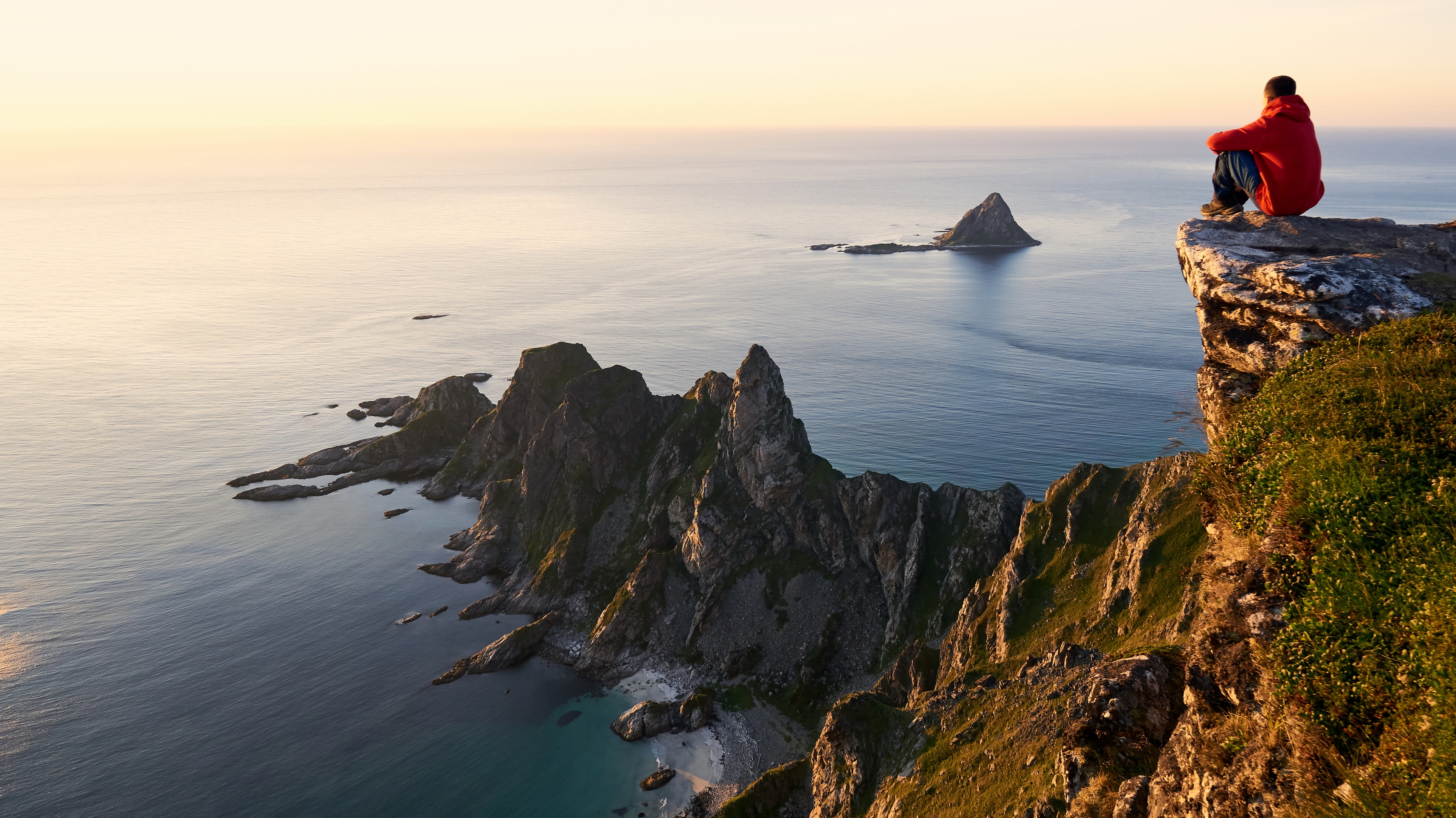 Description: A person sitting on a cliff overlooking the ocean and a rock formation in the distance with a boat in the water.