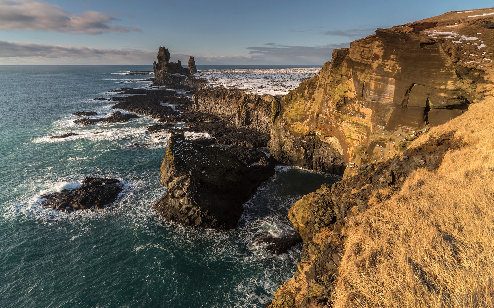 Description: A cliff with a body of water and a cliff face with a few rocks on it and a few cliffs on the other side.