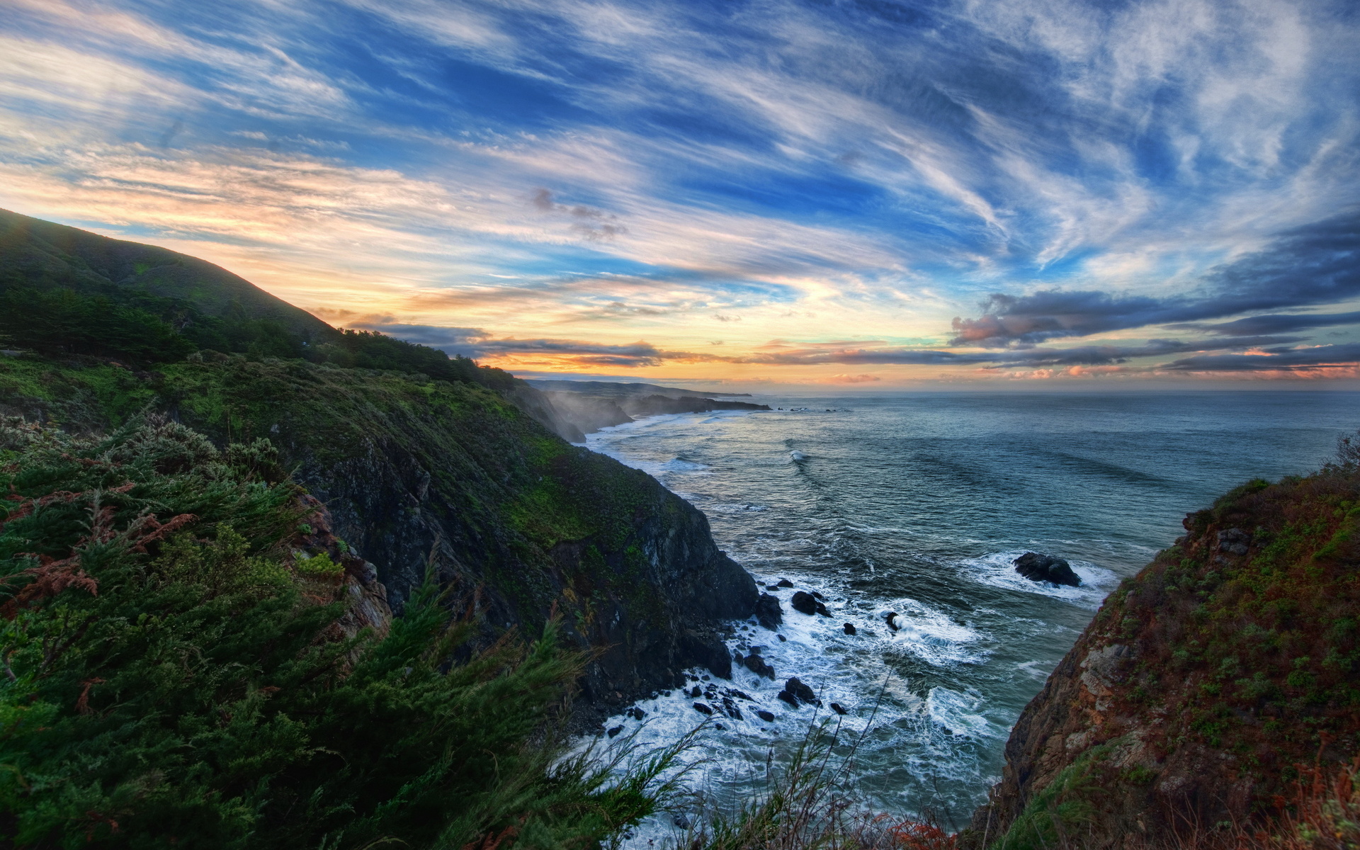 Description: A view of a cliff with a body of water and a sunset in the background with clouds in the sky.