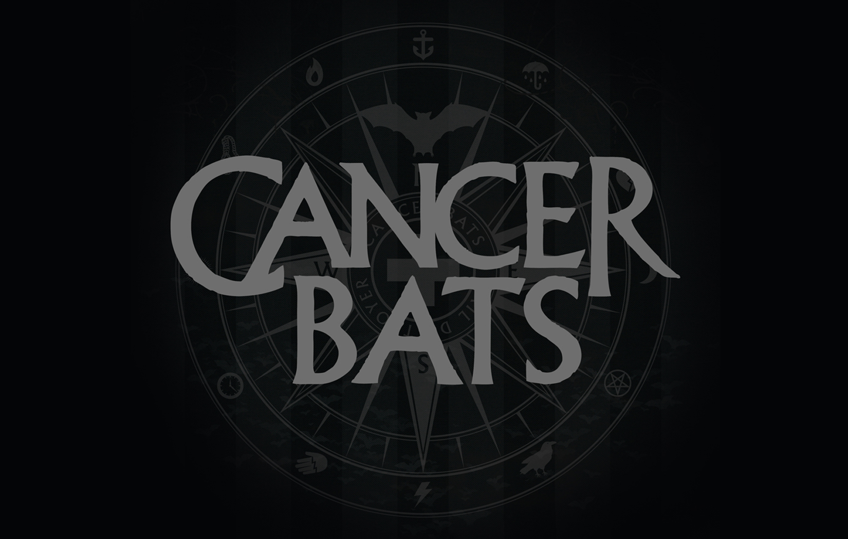 Description: A black and white photo of a clock with the words cancer bats on it and a bat on the clock.