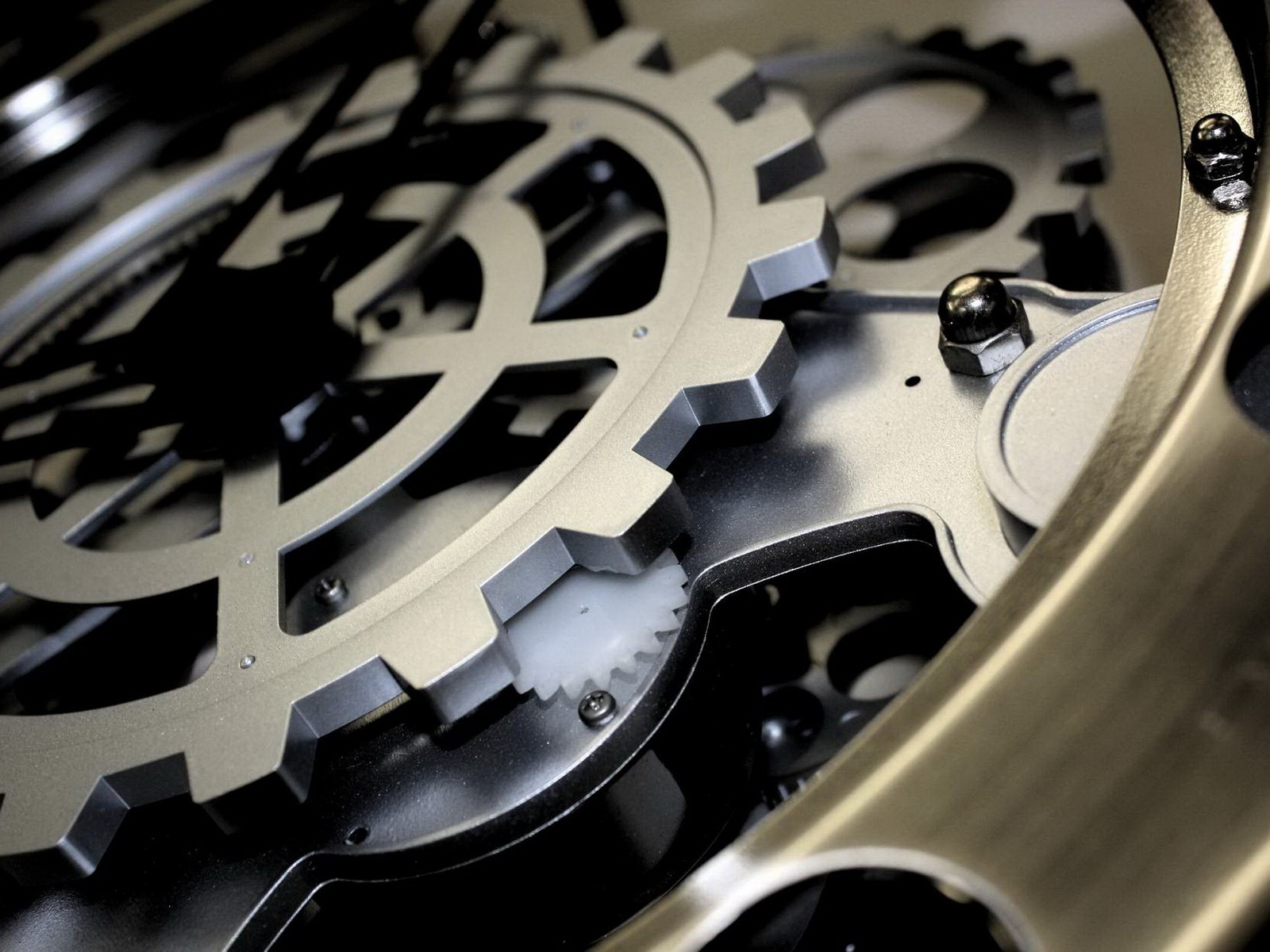 Description: A close up of a clock with gears on it's face and a clock dial on the face.