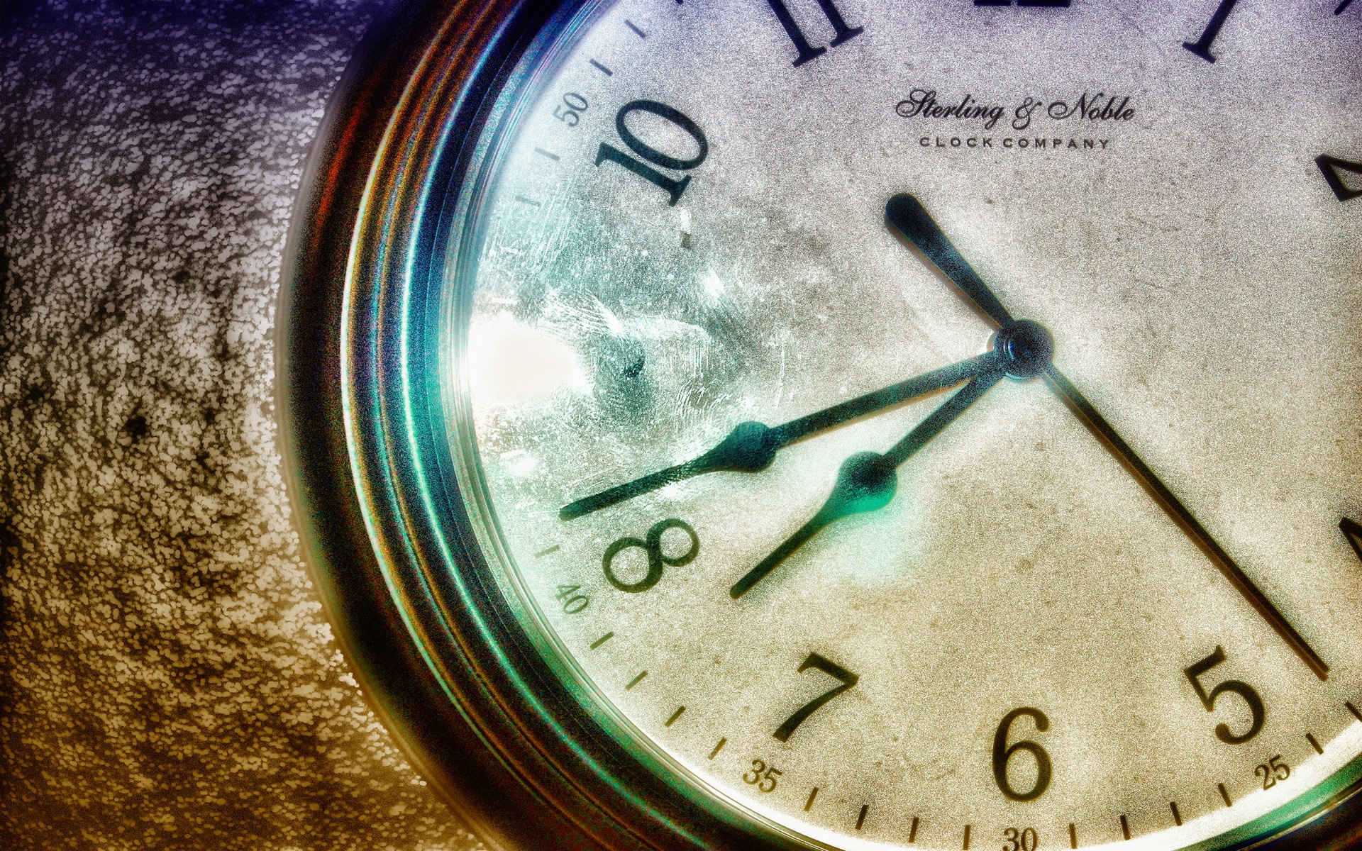 Description: A clock with a green second hand on a wall with a blue background and a white second hand on the clock.