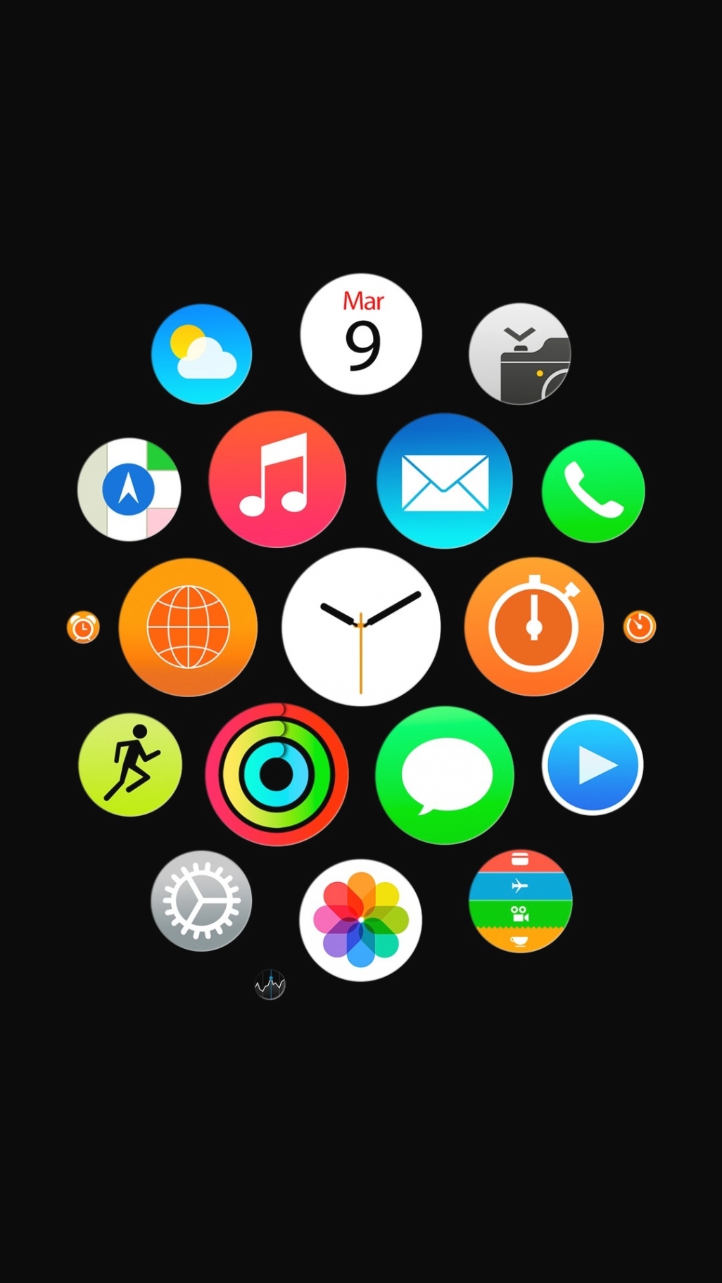 Description: A clock with different icons on it on a black background with a black background and a white clock with a red second hand.