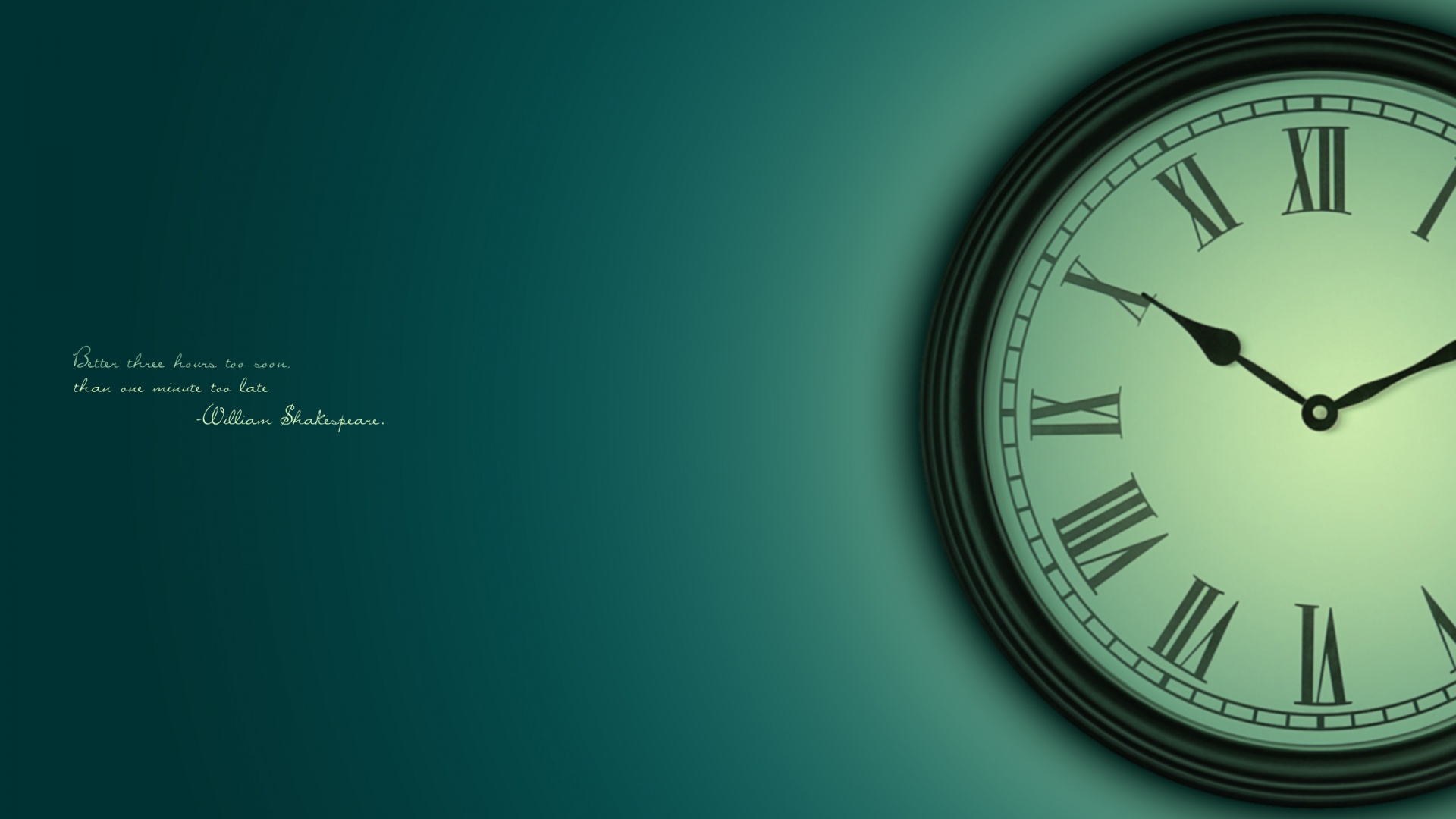 Description: A clock with roman numerals on a green background with a quote below it that reads.