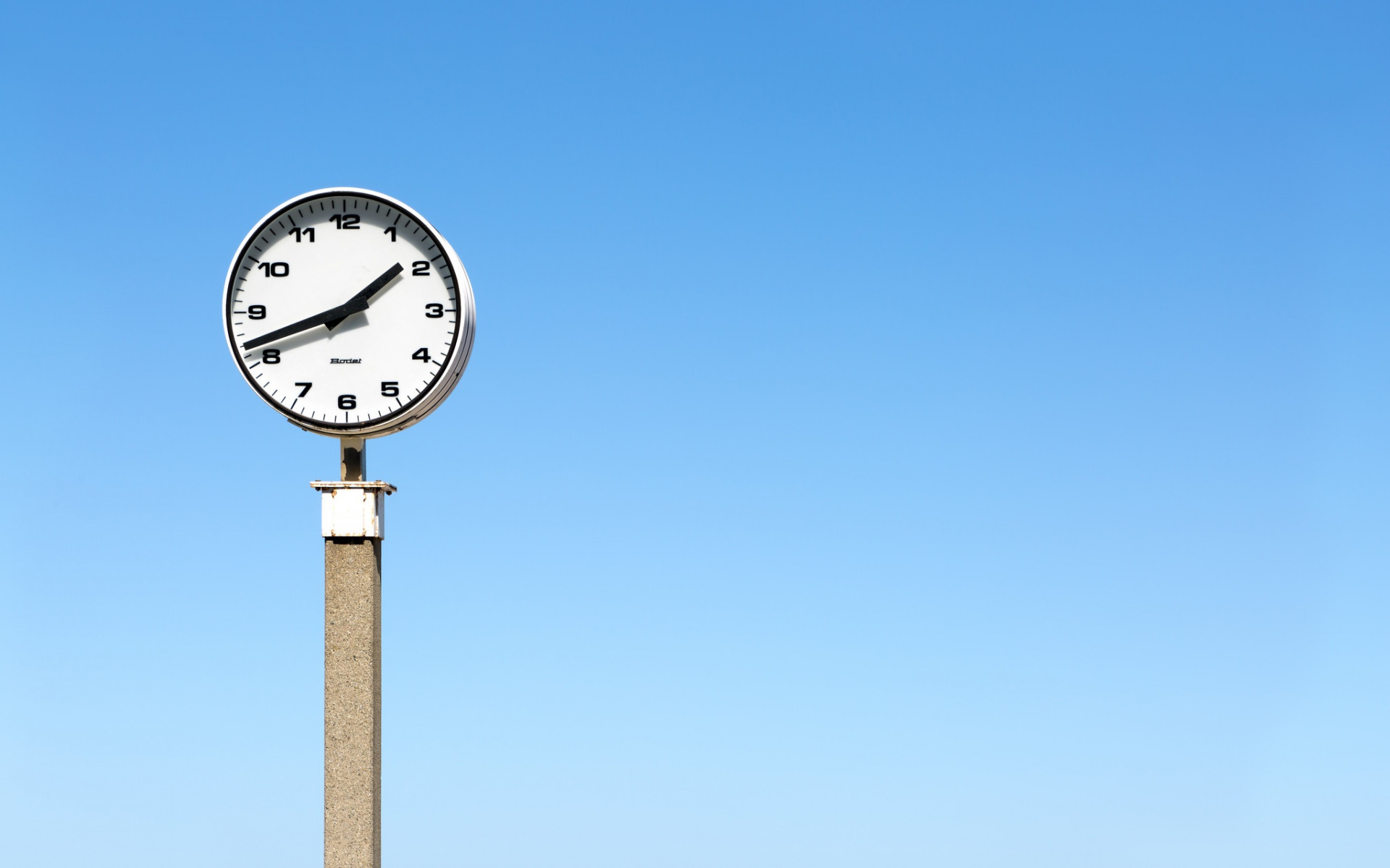 Description: A clock on a pole with a sky background in the background is a blue sky and there is a blue sky.