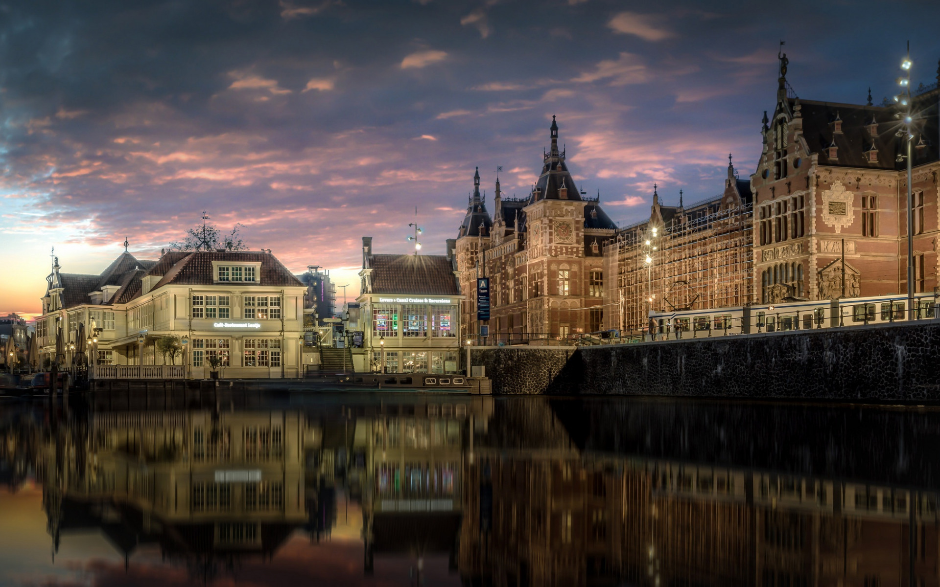 Description: A large building with a clock tower next to a body of water at night time with a cloudy sky.