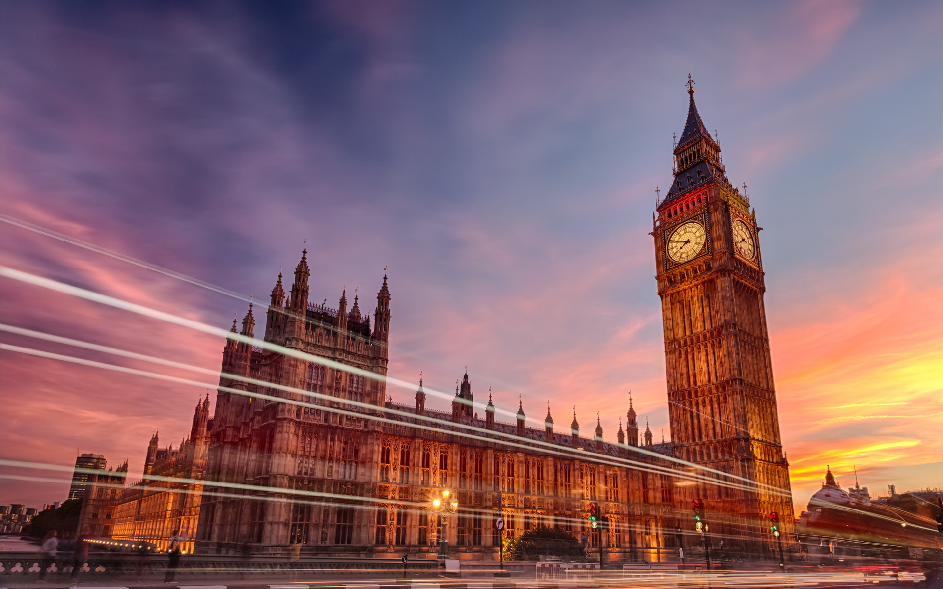 Description: A large clock tower towering over a city at sunset with a long exposure of light streaks in the foreground.