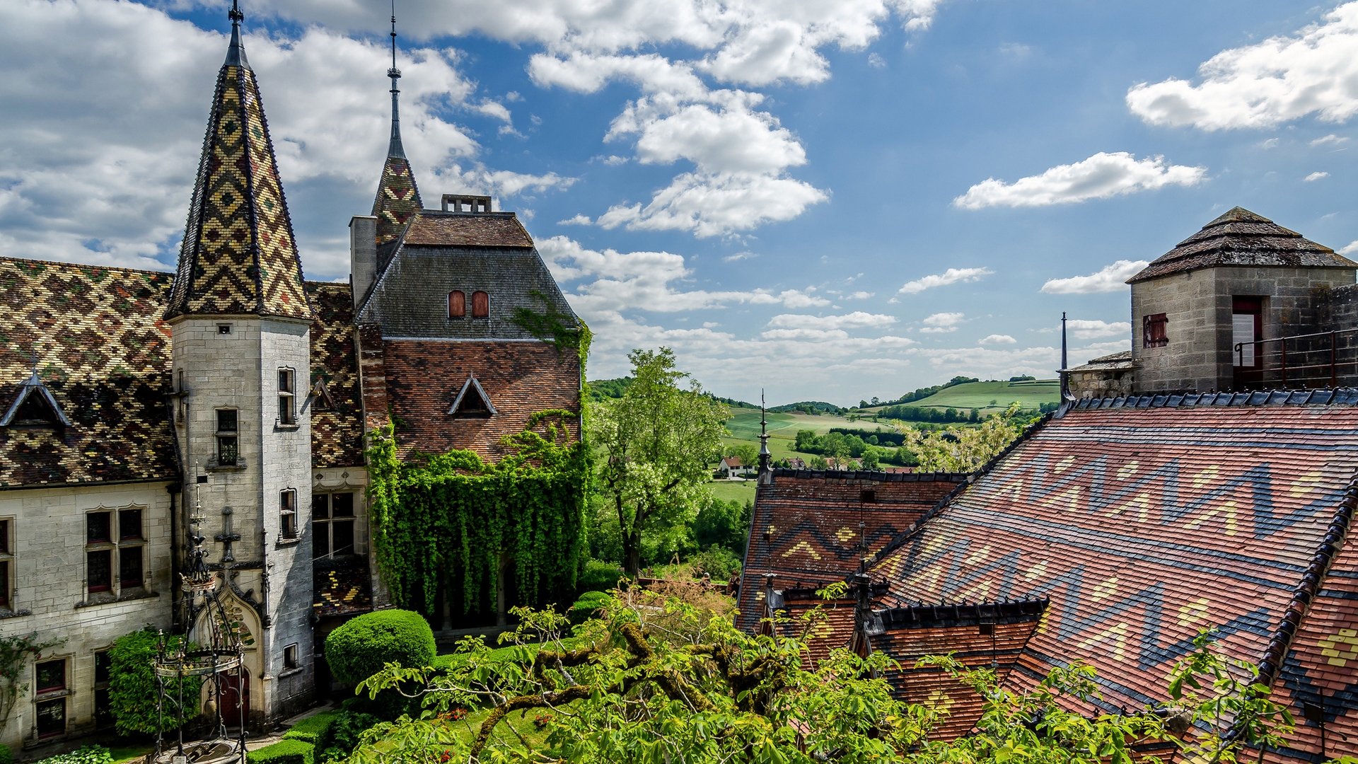 Description: A view of a building with a clock tower and a green field in the background with clouds in the sky.