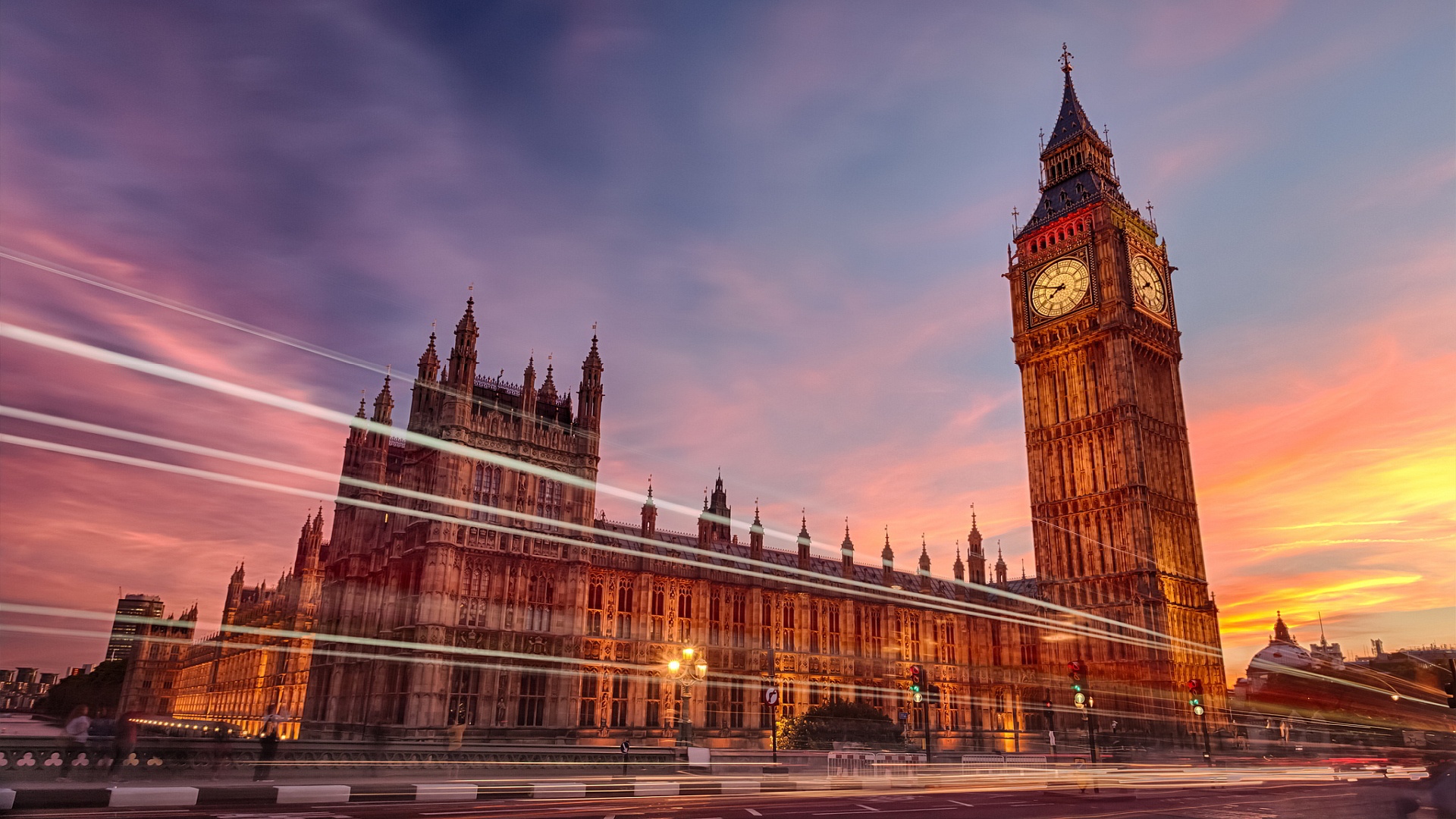 Description: A large clock tower towering over a city at sunset with a long exposure of light streaks in the foreground.