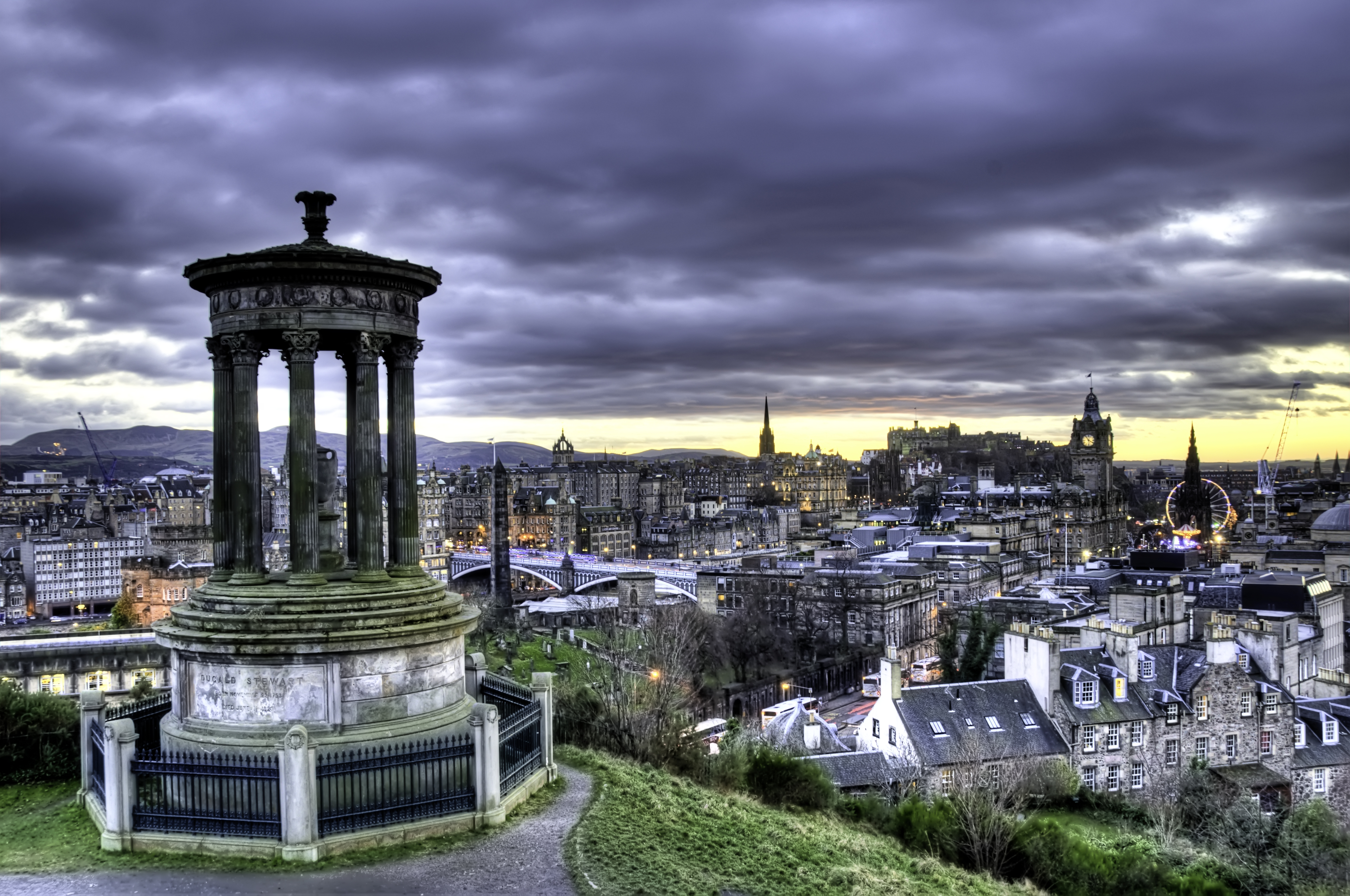 Description: A view of a city with a clock tower and a cloudy sky above it.