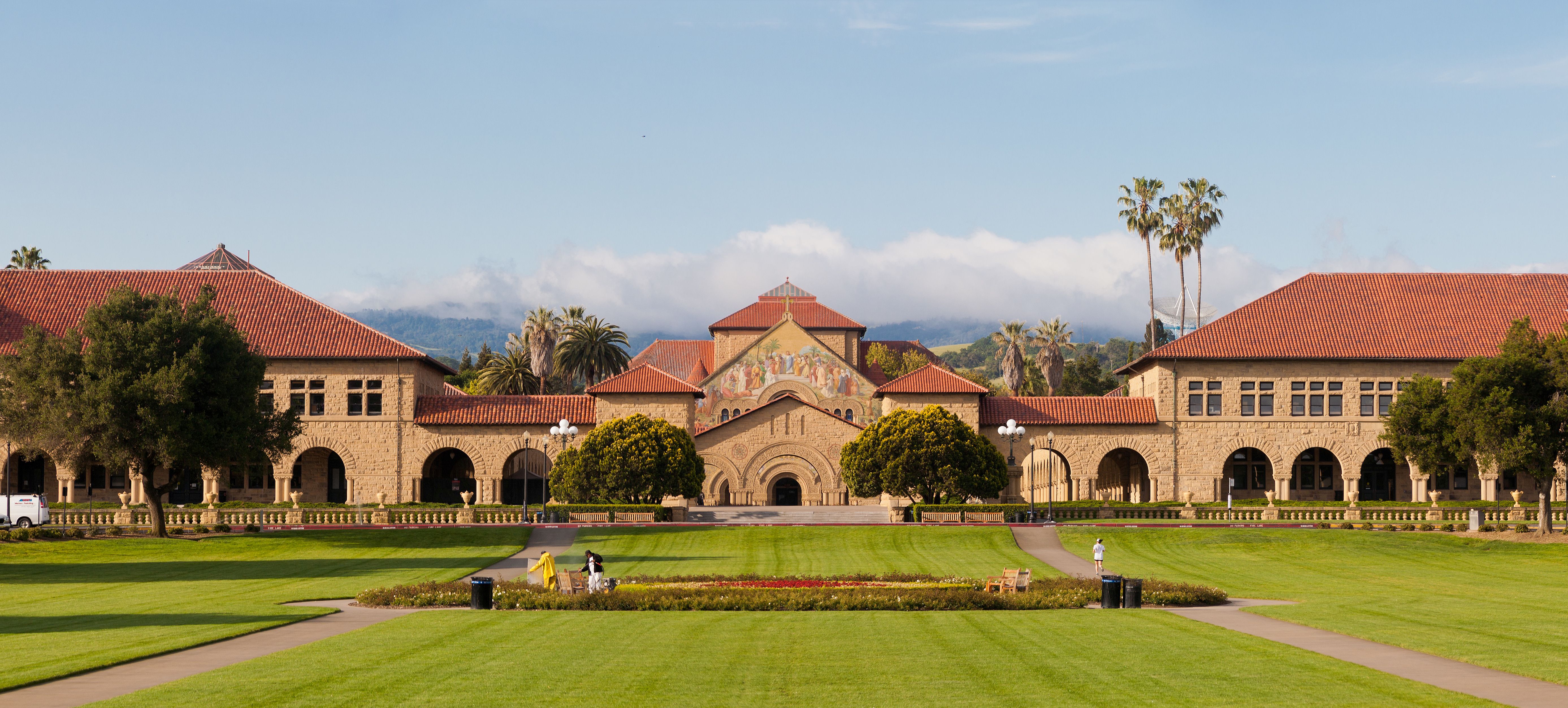 Description: A large building with a clock tower and a lawn in front of it and a few people walking around.