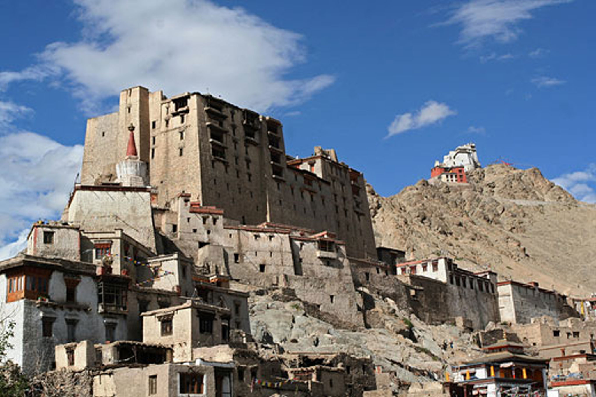Description: A large building with a clock on the top of it's face on a mountain side with a sky background.