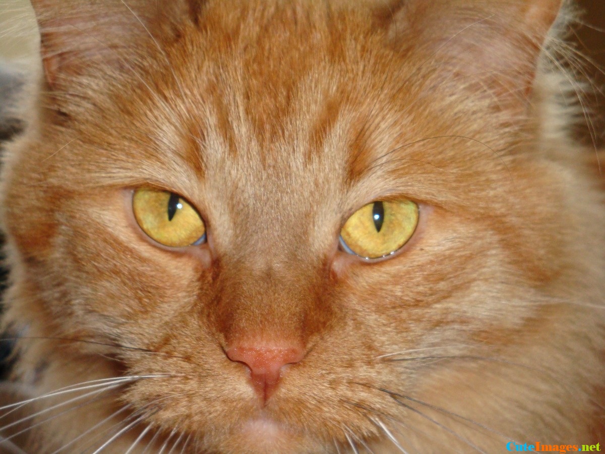 Description: A close up of a cat with yellow eyes and whiskers on it's face and a black cat behind it.