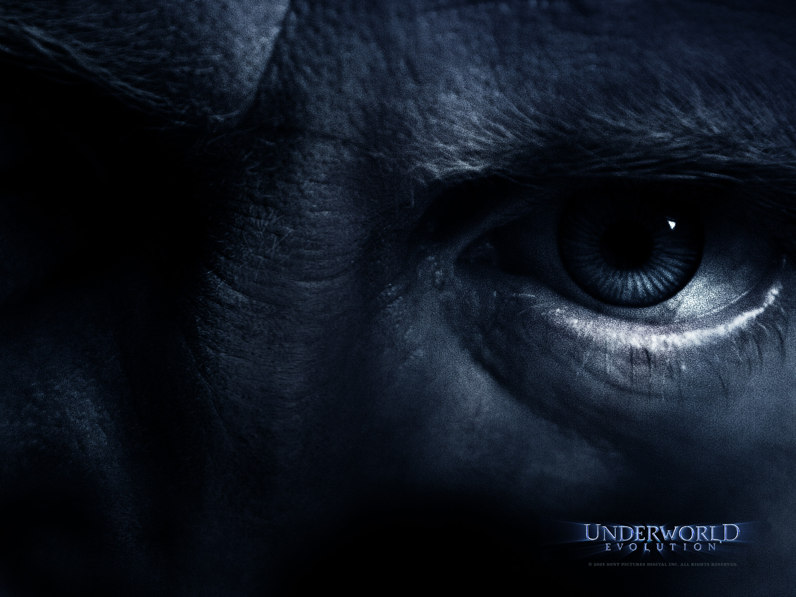 Description: A close up of a person's eye with the words underworld written on it in blue lettering.