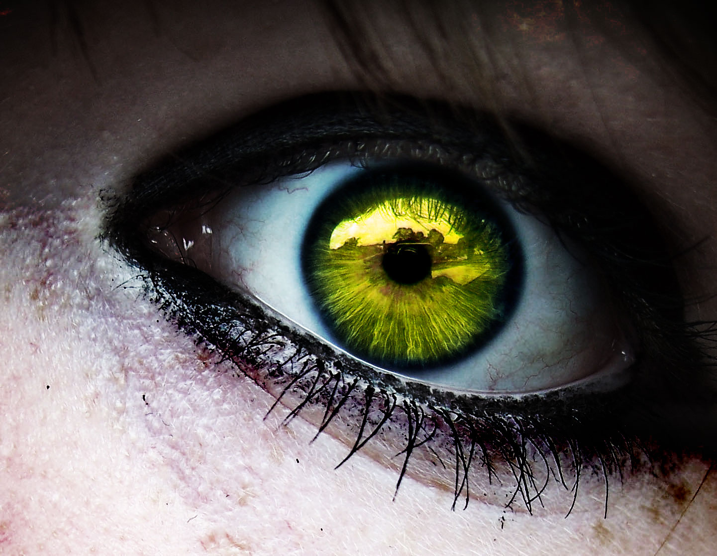 Description: A close up of a person's eye with a green iris and black tips on it's iris.