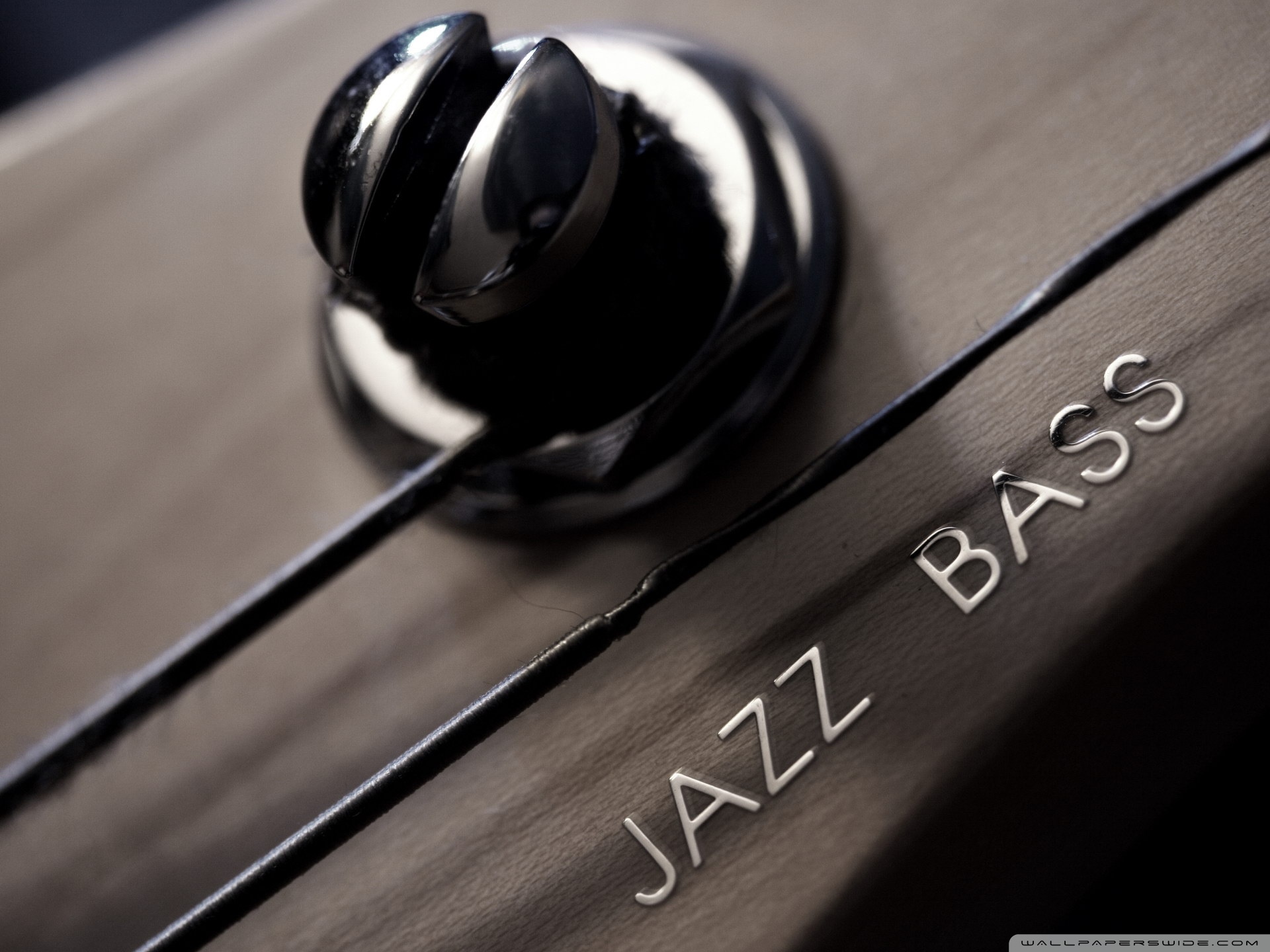 Description: A close up of a metal knob on a guitar with the word jazz on it's side and a black knob.