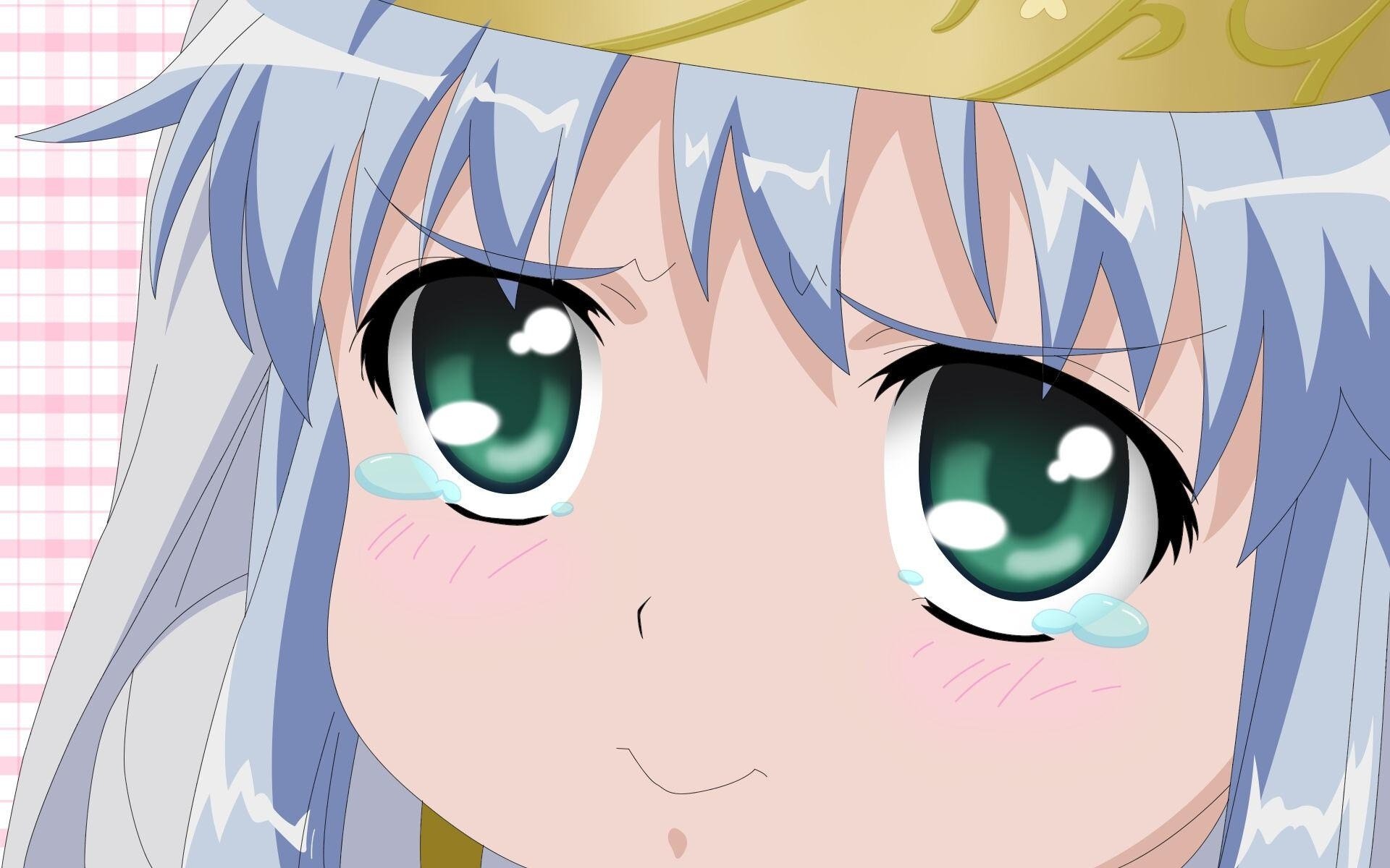 Description: A close up of a person with a crown on their head and a pink and white checkered background.