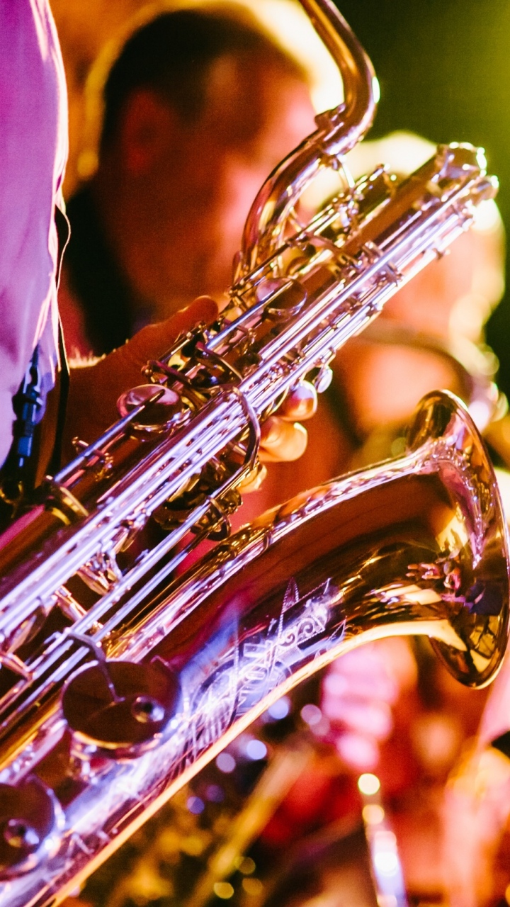 Description: A close up of a person playing a musical instrument with other people in the background behind him and a person in the foreground.